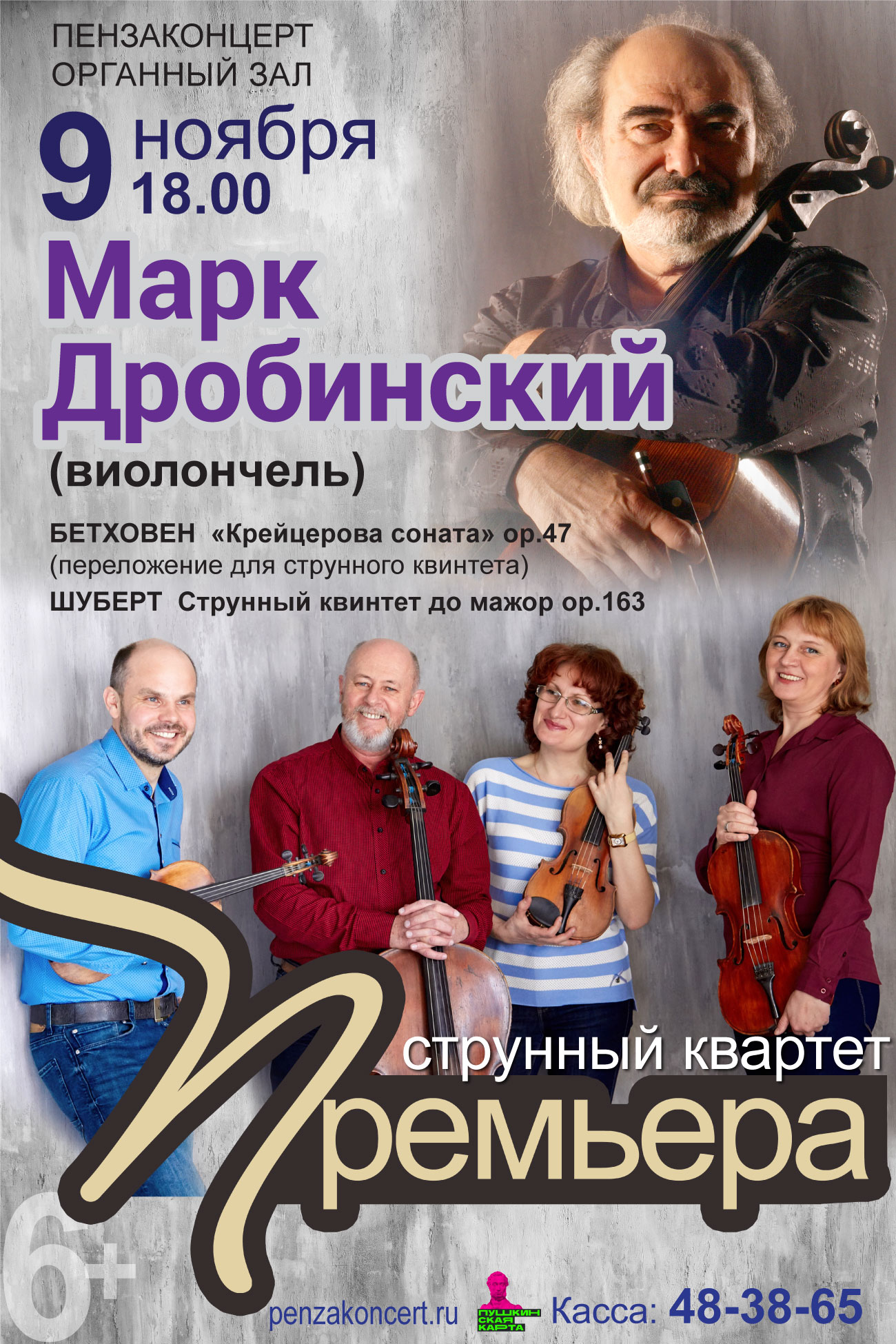 Вместе со струнным квартетом «Премьера» Марк Дробинский исполнит великие произведения — «Крейцерову сонату» Л. Бетховена и Струнный квинтет до мажор Ф. Шуберта.