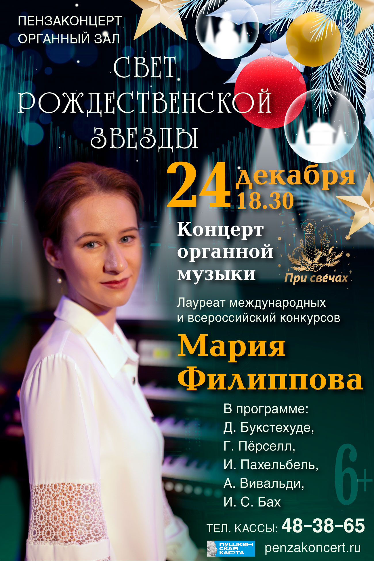 Лауреат международных и всероссийский конкурсов Мария Филиппова представляет концерт органной музыки при свечах "Свет Рождественской звезды". В программе прозвучат следующие произведения: