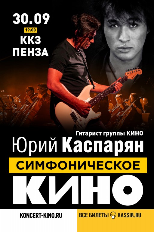 Легендарный проект Симфоническое «Кино» возвращается в Пензу с большим юбилейным концертом! Гитарист группы «Кино» Юрий Каспарян совместно с большим симфоническим оркестром представит на сцене «ККЗ ПЕНЗА» обновленную программу лучших песен Виктора Цоя в оригинальной симфороковой интерпретации. Концерт состоится в рамках большого юбилейного тура, посвященного 35-летию выхода «Черного альбома» и 15-летию основания проекта Симфоническое «Кино». Зрителям будет представлен обновленный видеоряд, разработанный сыном Виктора Цоя, Александром, и композиции, группы «Кино» ранее не звучавшие на концертах проекта. Фронтмен проекта Юрий Каспарян – близкий друг и соратник Виктора Цоя, знаковая фигура для всех «киноманов», чьи гитарные партии являются визитной карточкой многих песен легендарного коллектива. Состав проекта Симфоническое «Кино» впечатляет: на сцену выйдут 45 музыкантов симфонического оркестра, барабанщик группы «Кино» Олег Шунцов, бас-гитарист Виктор Савич и сам Юрий Каспарян. Дирижером приглашен Антон Шабуров – многократный лауреат международных конкурсов и обладатель различных знаковых музыкальных премий В программе концерта традиционно прозвучат нетленные «Группа Крови», «Звезда по имени Солнце», «Спокойная ночь», «Перемен», «Пачка сигарет» и другие яркие композиции Концерт состоится 26 марта. Начало в 19.00 Продолжительность программы 1 час 40 минут без антракта.