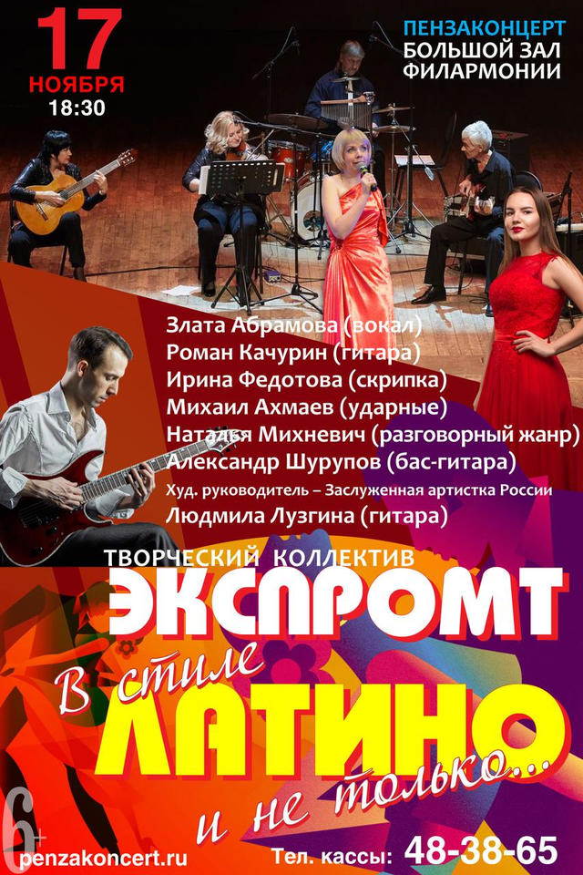Творческий коллектив «Экспромт» приглашает на сольный концерт! Заслуженная артистка России Людмила Лузгина (гитара) и артисты «Экспромта» выступят с новой яркой программой под названием «В стиле Латино» (6+).