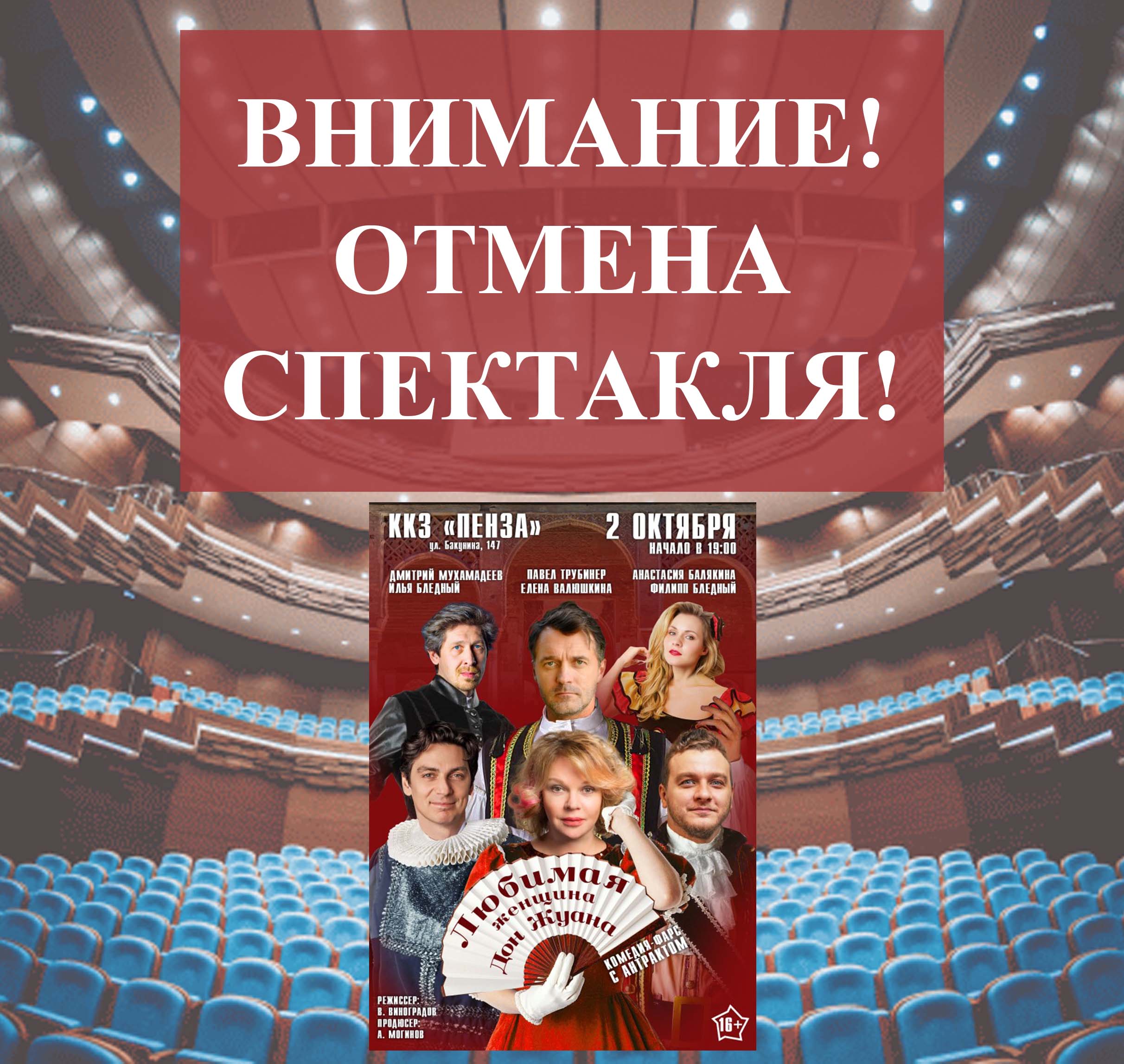 Спектакль «Любимая женщина Дон Жуана», который должен был состояться 2 октября в 19:00 в киноконцертном зале «Пенза» отменяется.