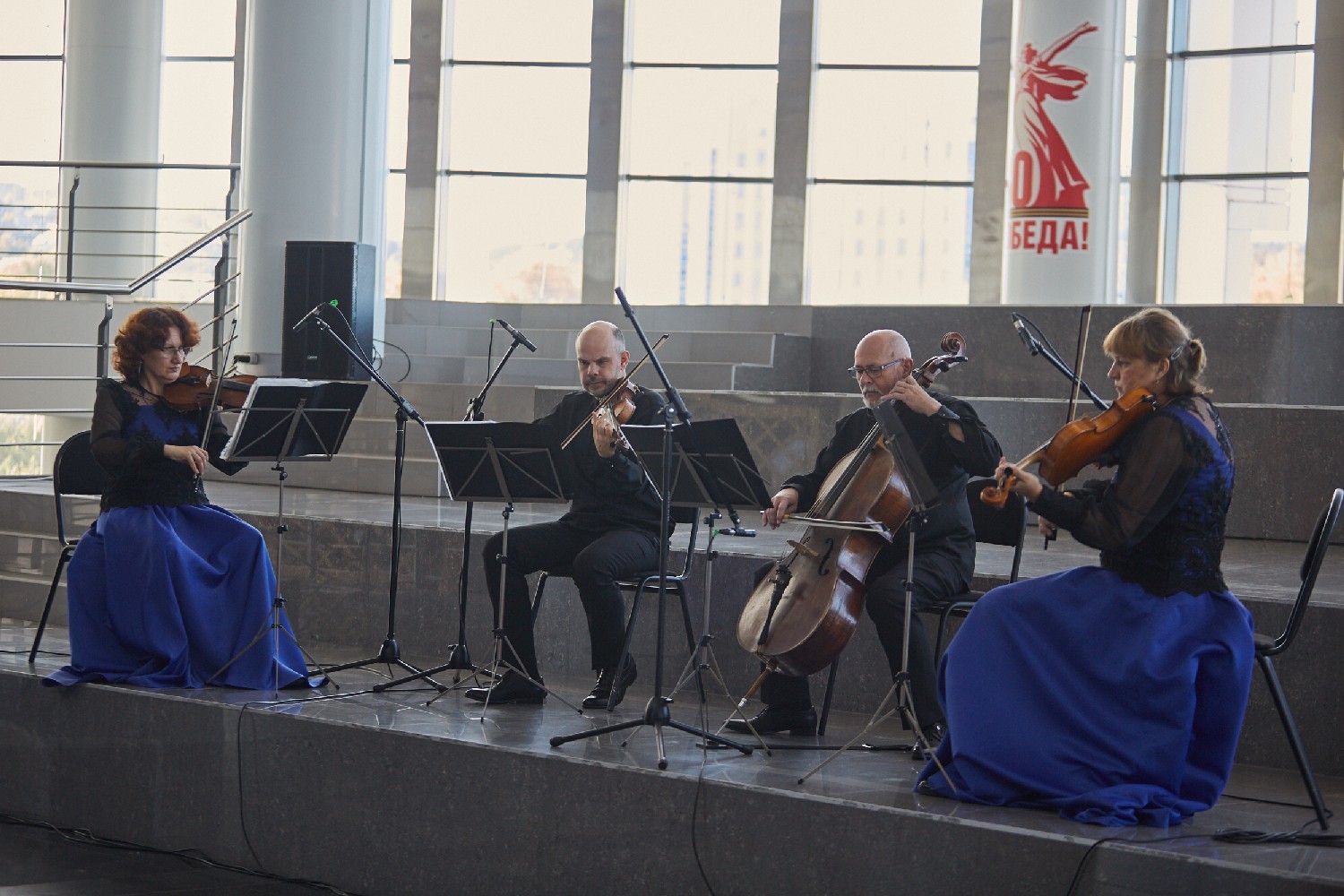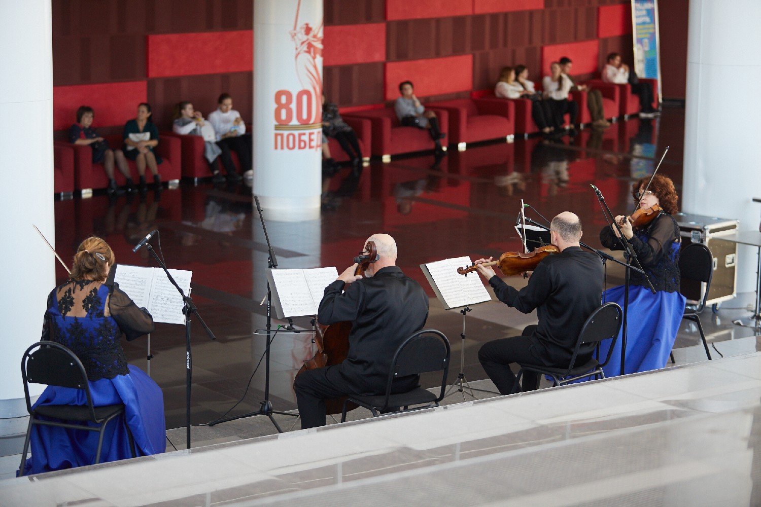 Перед началом мероприятия в фойе второго этажа гостей встречал струнный квартет «Премьера» музыкальной программой из цикла «Добро пожаловать!».