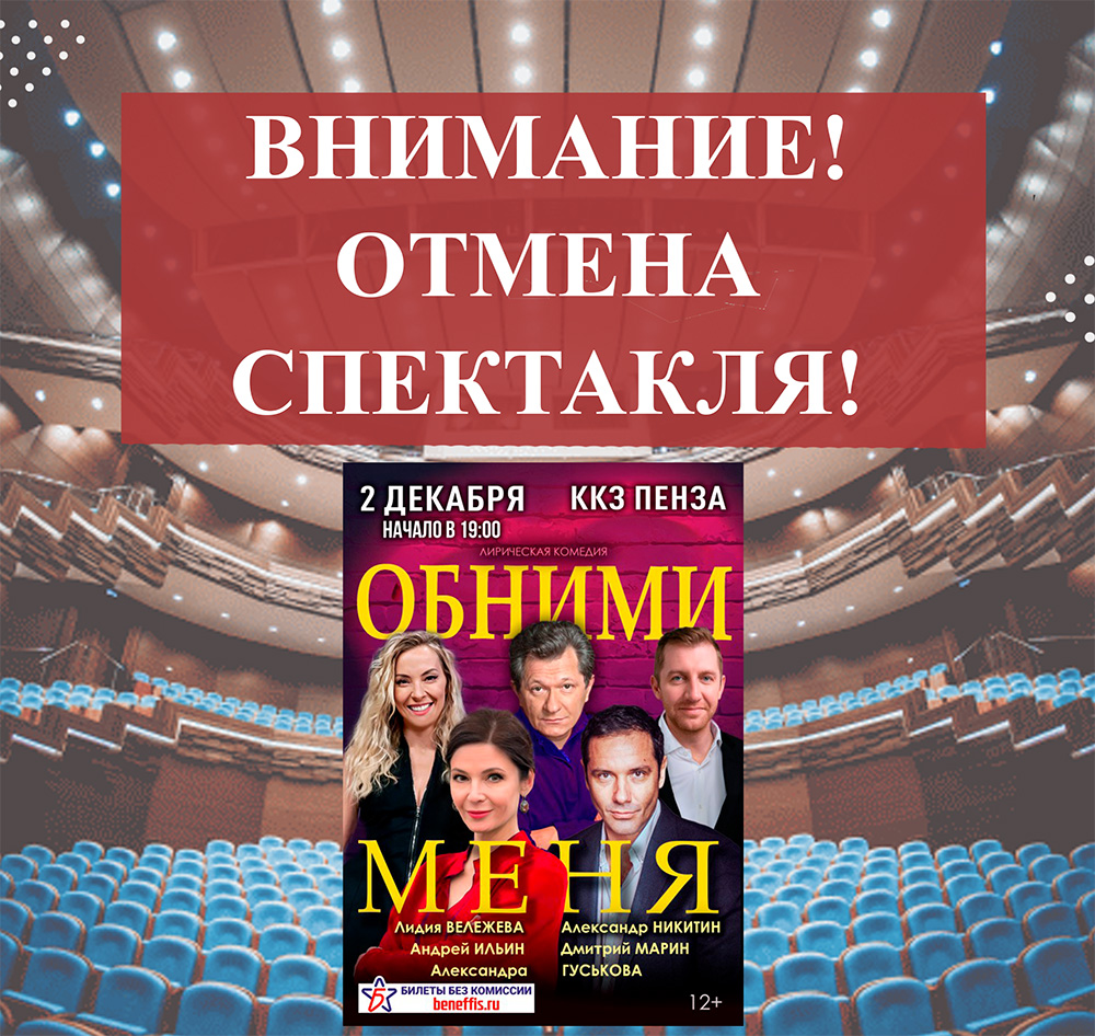 Спектакль «Обними меня», который должен был состояться 2 декабря в 19:00 в киноконцертном зале «Пенза», отменяется.