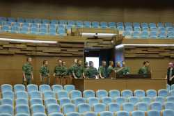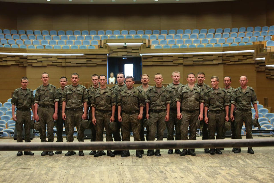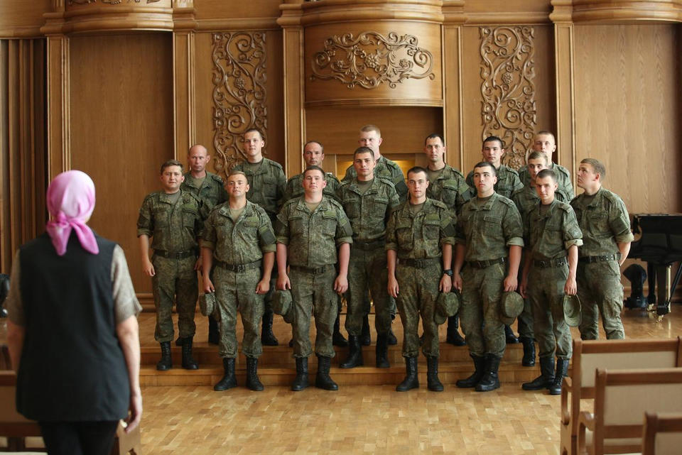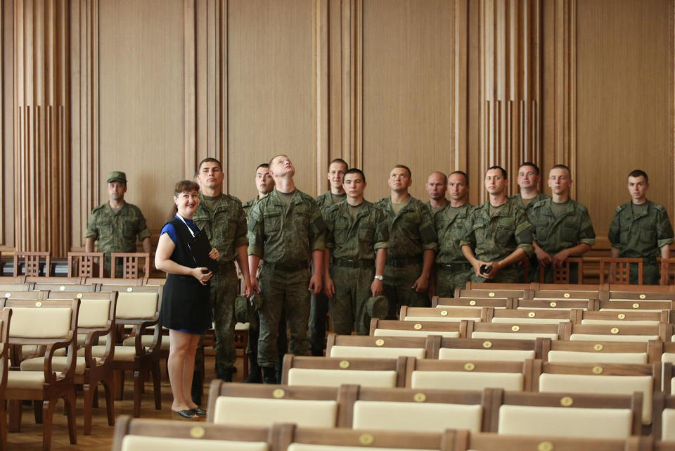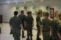 В фойе филармонии военнослужащие посетили выставку детских рисунков, открывшуюся накануне.