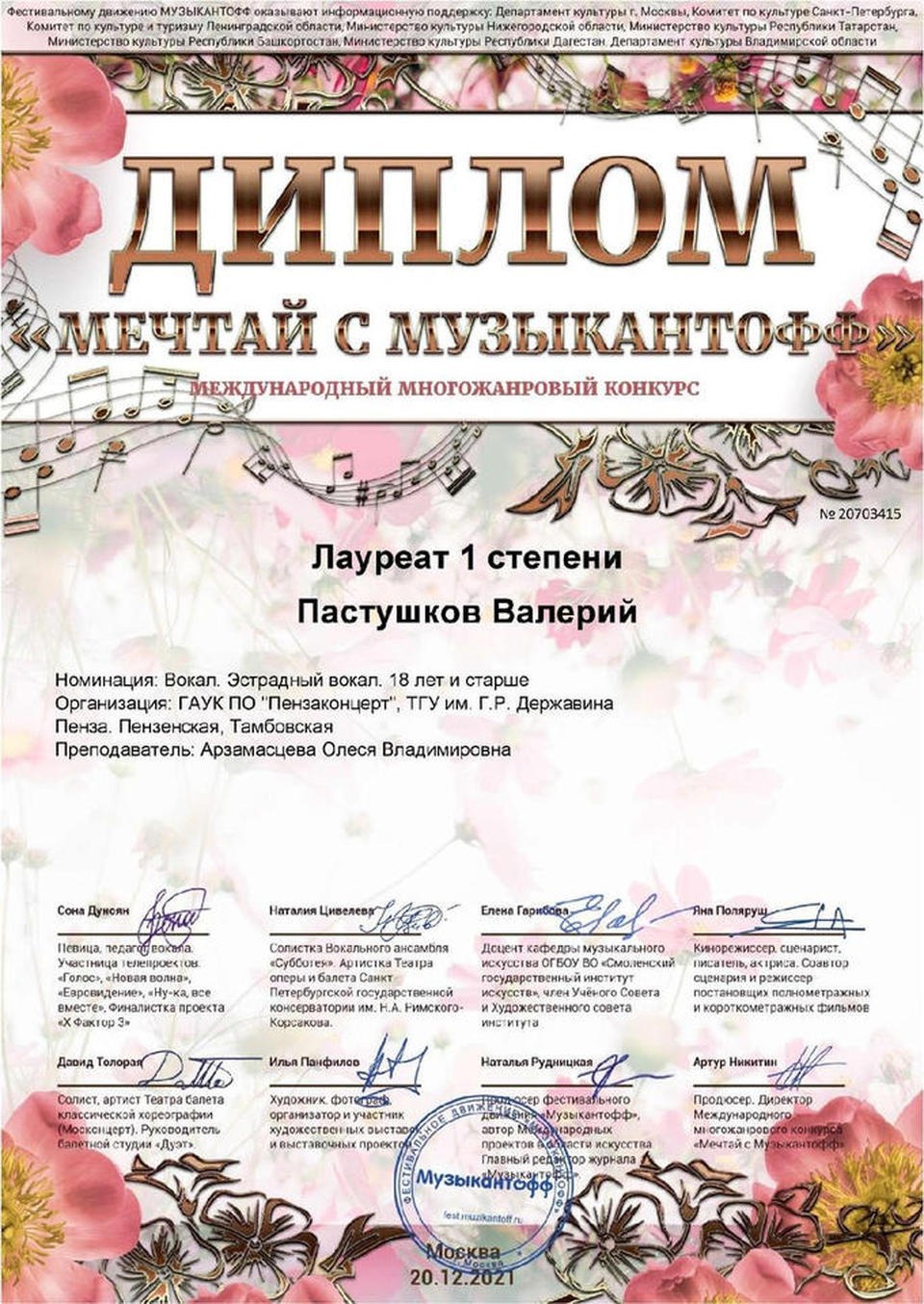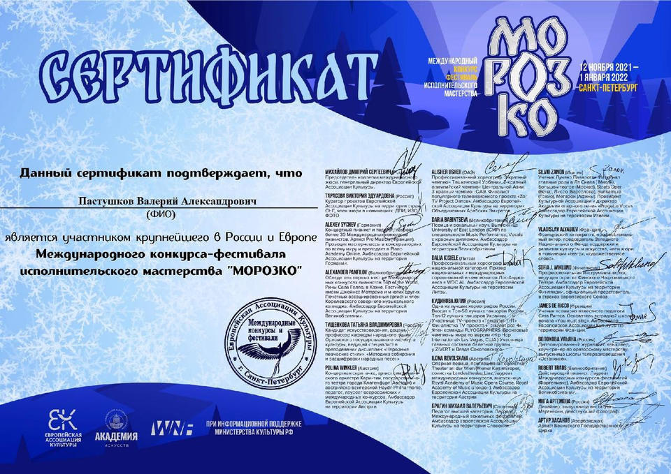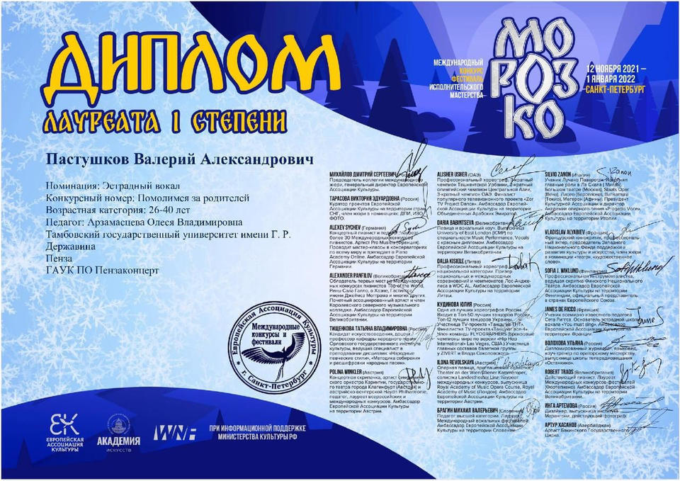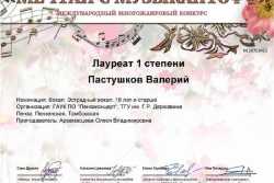 Артист группы «Калейдоскоп» Валерий Пастушков стал лауреатом I степени двух конкурсов – Международного конкурса-фестиваля исполнительского мастерства «Морозко» (г. Санкт-Петербург) и Международного многожанрового конкурса «Мечтай с Музыкантофф» (г. Москва).