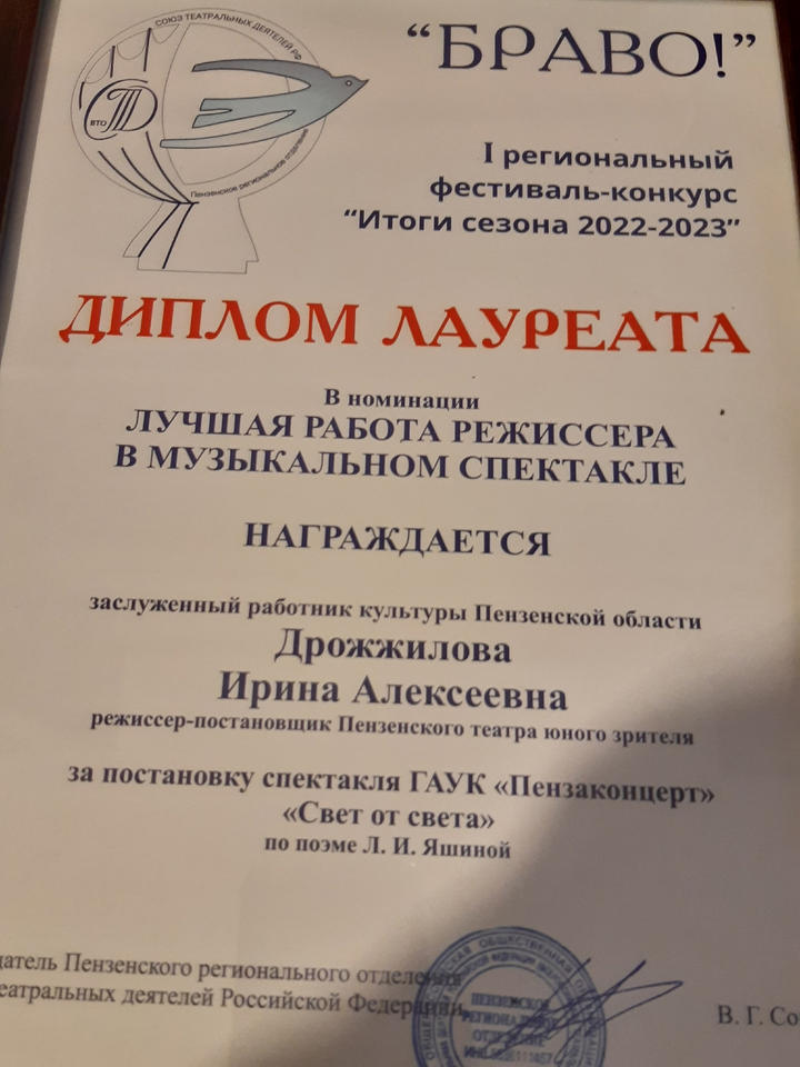 В номинации «Лучшая работа режиссера в музыкальном спектакле» победителем стала заслуженный работник культуры Пензенской области Ирина Алексеевна Дрожжилова за постановку спектакля «Свет от света» ГАУК «Пензаконцерт».