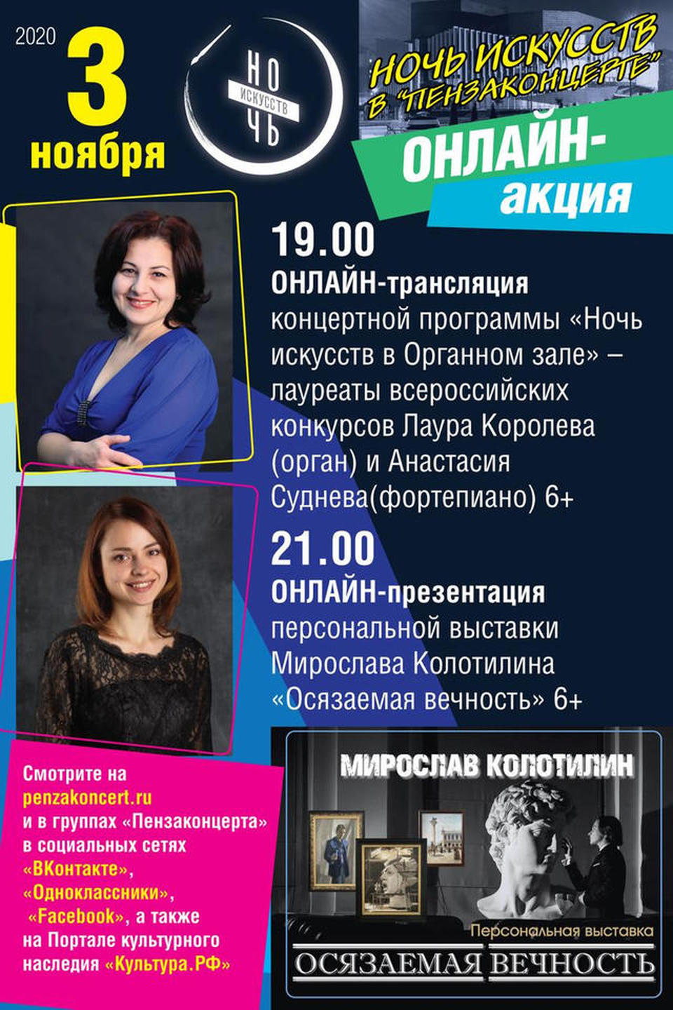ГАУК ПО «Пензаконцерт» присоединится к ОНЛАЙН-акции «Ночь искусств», и главными её площадками станут официальный сайт и группы «Пензаконцерта» в социальных сетях «ВКонтакте», «Одноклассники», «Facebook», а также Портал культурного наследия «Культура.РФ».