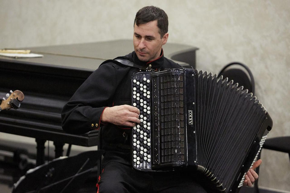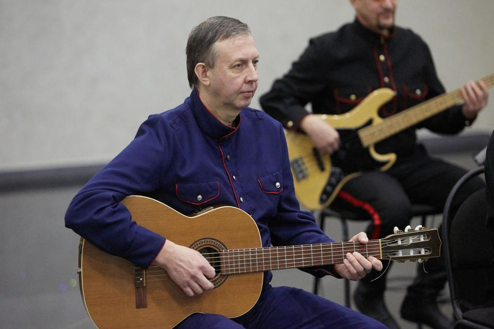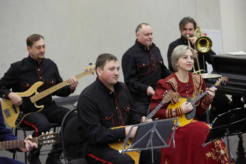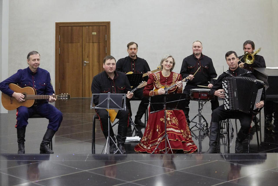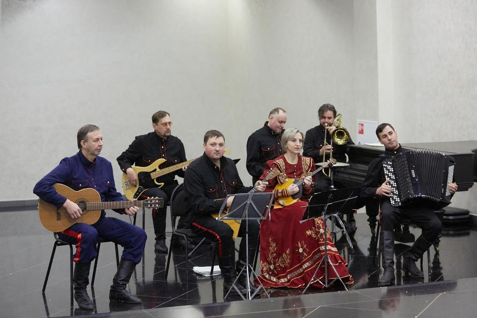 Перед концертом зрителей с программой «Добро пожаловать!» встречали артисты оркестровой группы ансамбля песни и танца «Казачья застава».