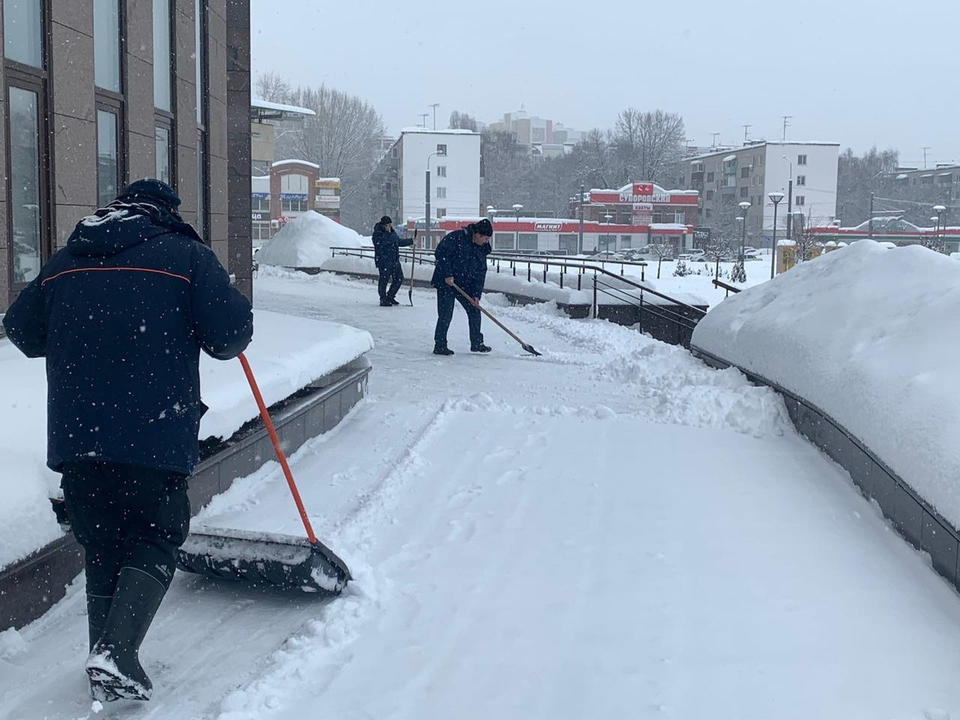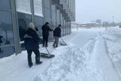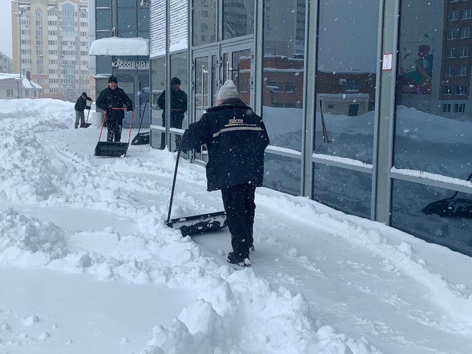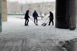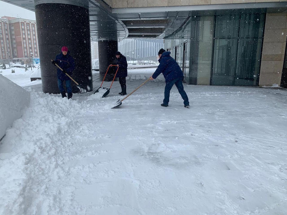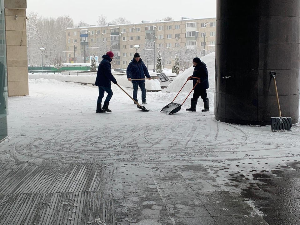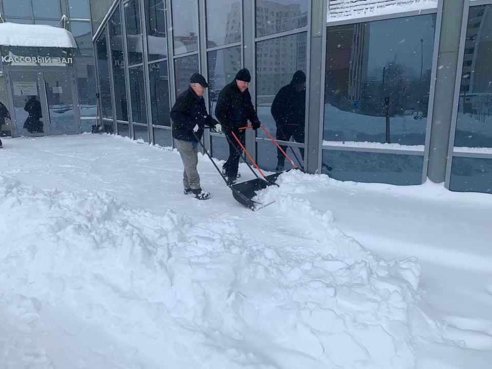 Вместе с техническим персоналом участие в работах принимают сотрудники других отделов, расчищая от снега территории возле центрального входа в здания, пандусы, зону у кассового зала.