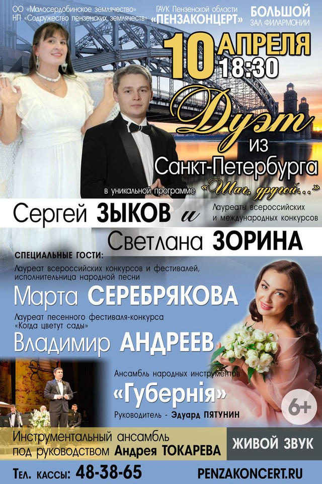10 апреля в Большом зале филармонии зрителей ждёт уникальная концертная программа «Шаг, другой...» (6+) в исполнении замечательного дуэта из Санкт-Петербурга – Сергея Зыкова и Светланы Зориной – в гармоничном сопровождении инструментального ансамбля под управлением Андрея Токарева!