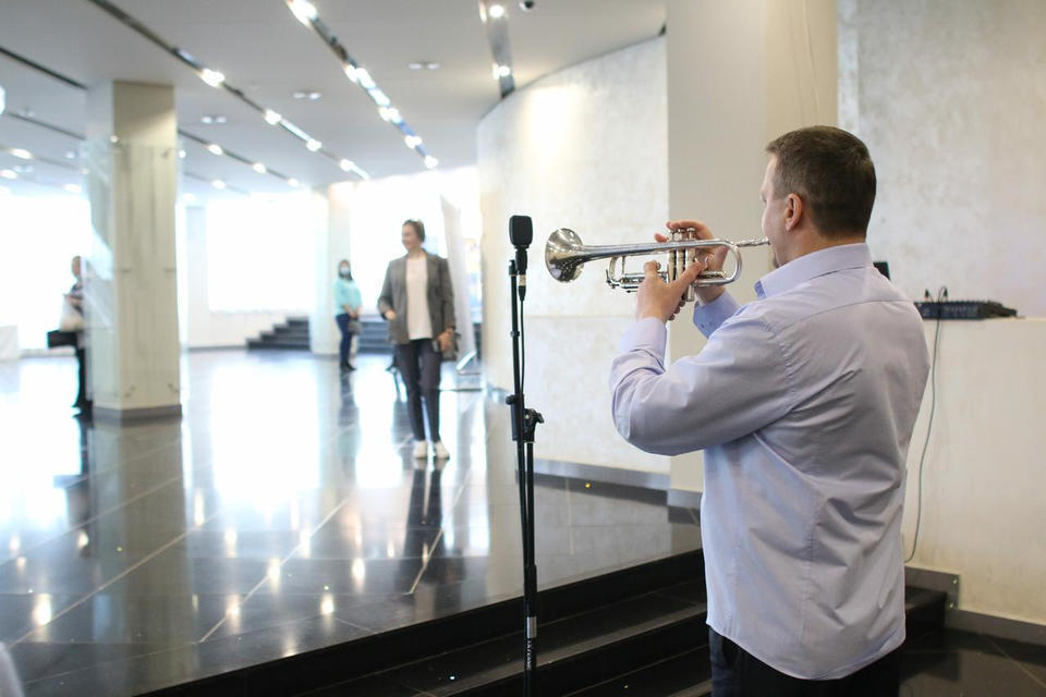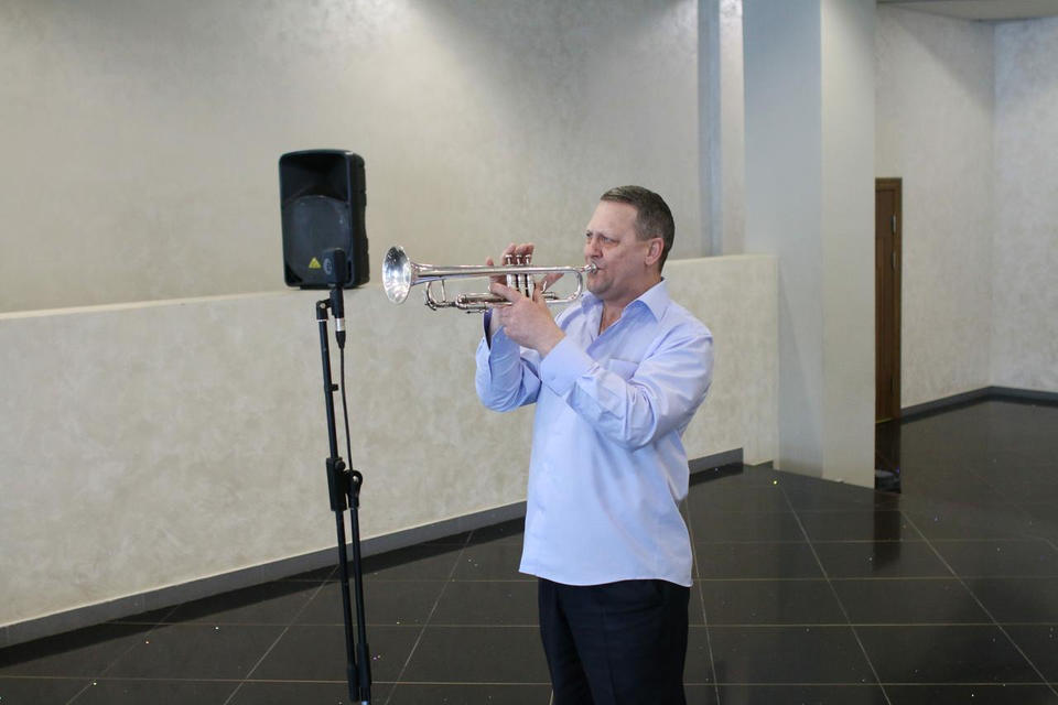 Перед концертом зрителей с программой «Добро пожаловать!» встречал артист ансамбля песни и танца «Казачья застава» Александр Мереняшев (труба).