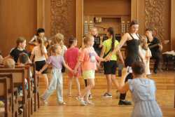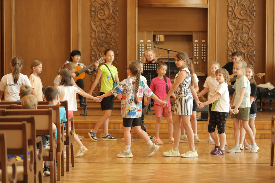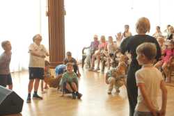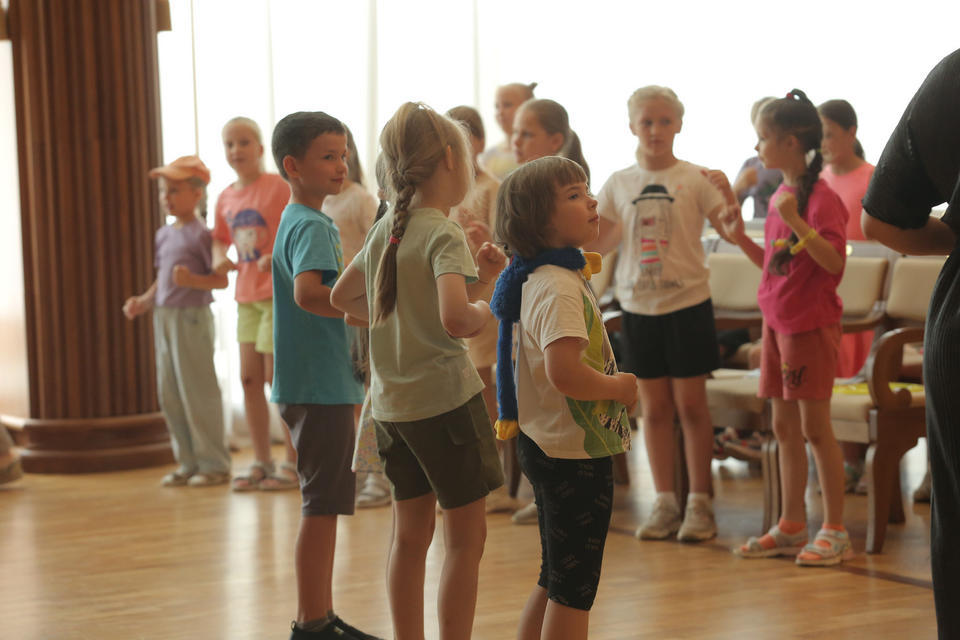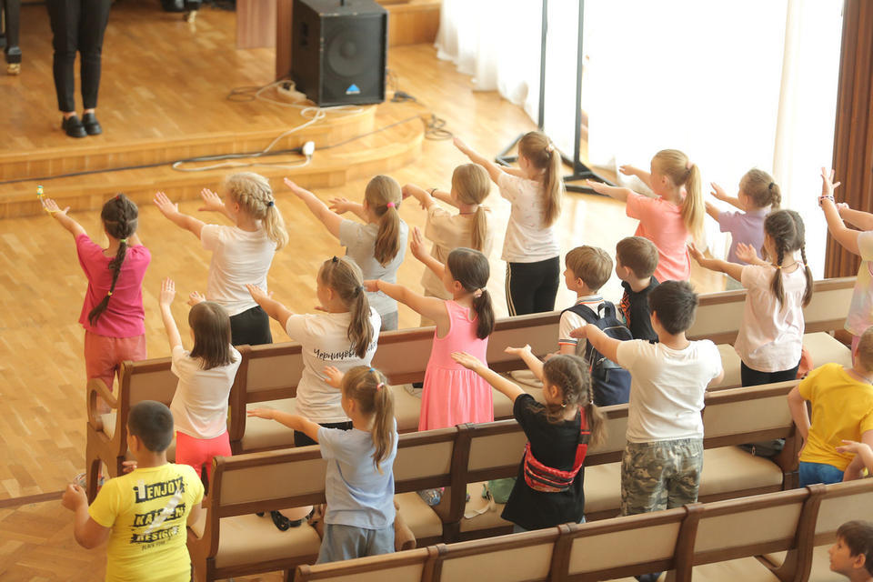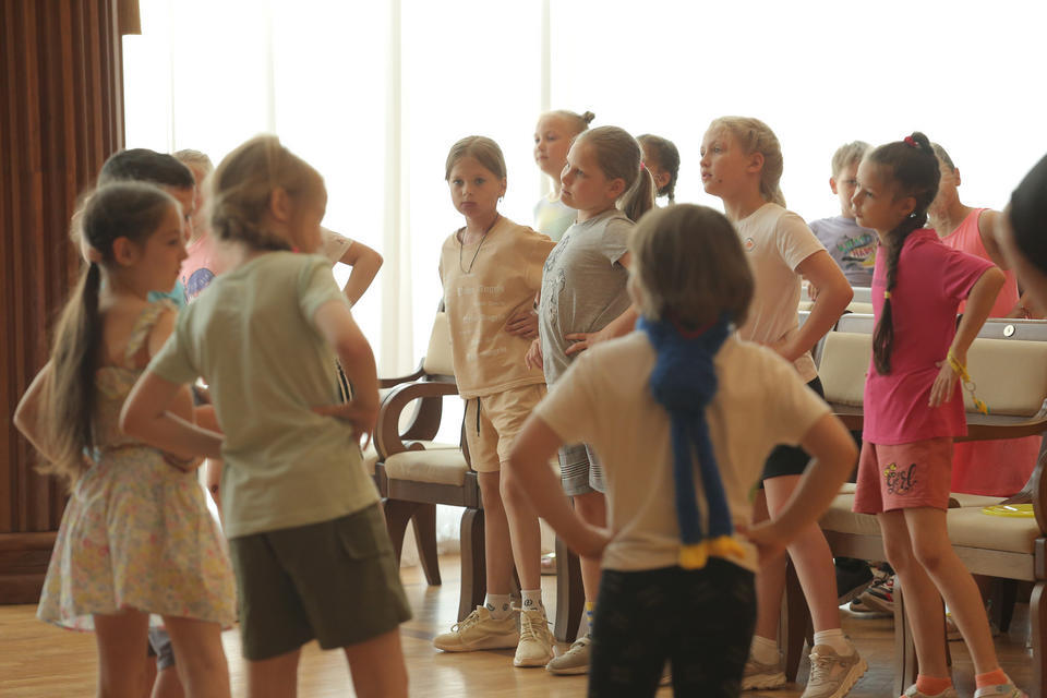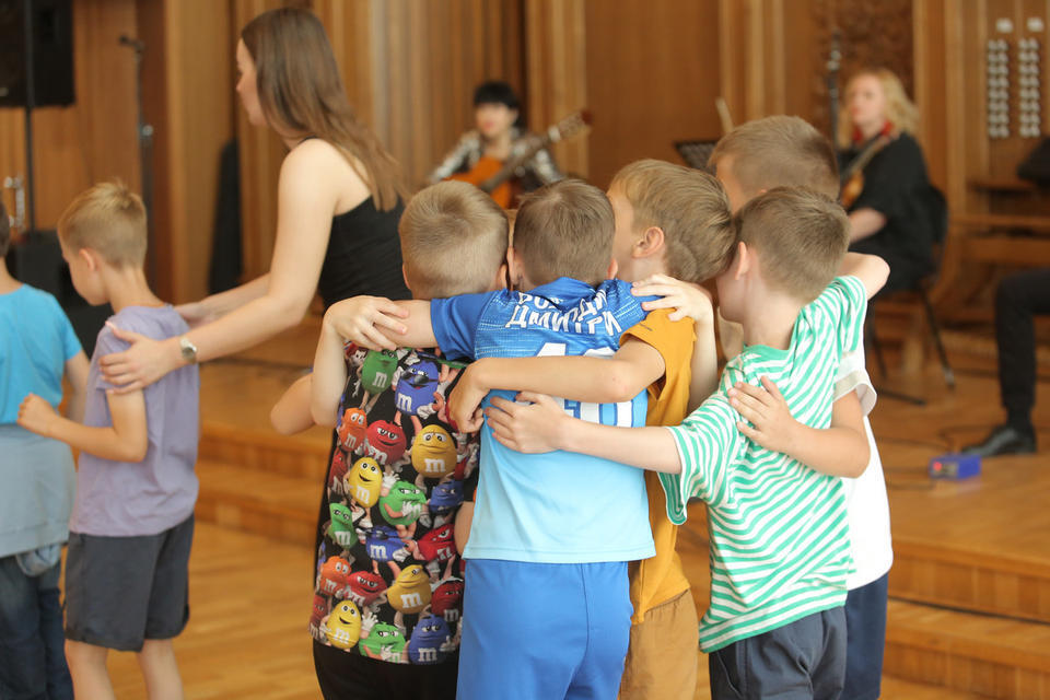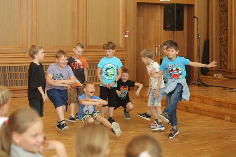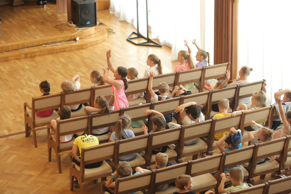 В завершении программы юные гости филармонии поиграли в лимбо: проходили под меняющей свое горизонтальное положение натянутой лентой.