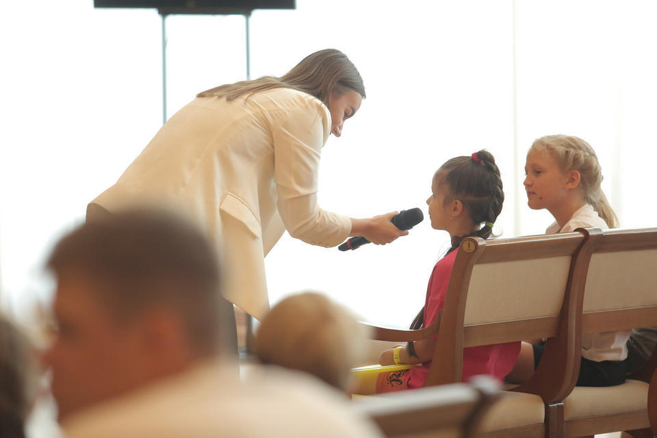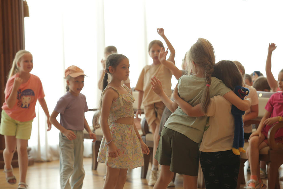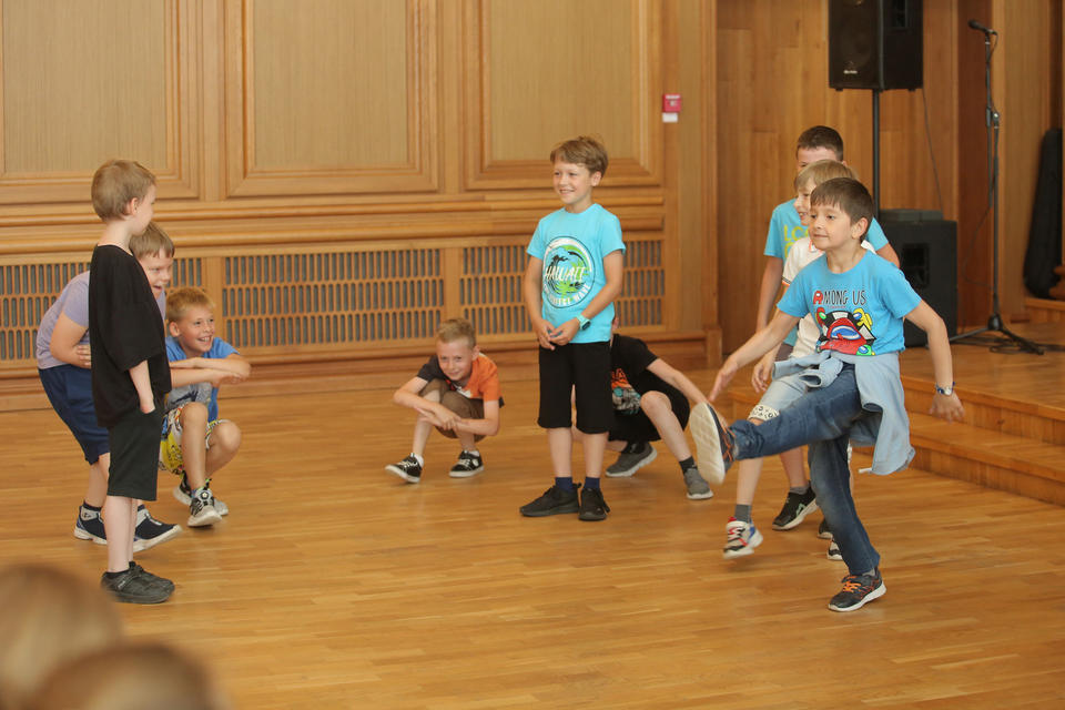 Ребята слушали и подпевали песням из любимых детских мультфильмов и фильмов, такие как «Красная шапочка», «Фиксики», «Бременские музыканты», «Буратино», отвечали на вопросы ведущей на разные темы и даже танцевали. Сначала разучили танец макарена, а затем мысленно перенеслись на сто лет назад: девочки водили хоровод, а мальчики устроили задорный перепляс.