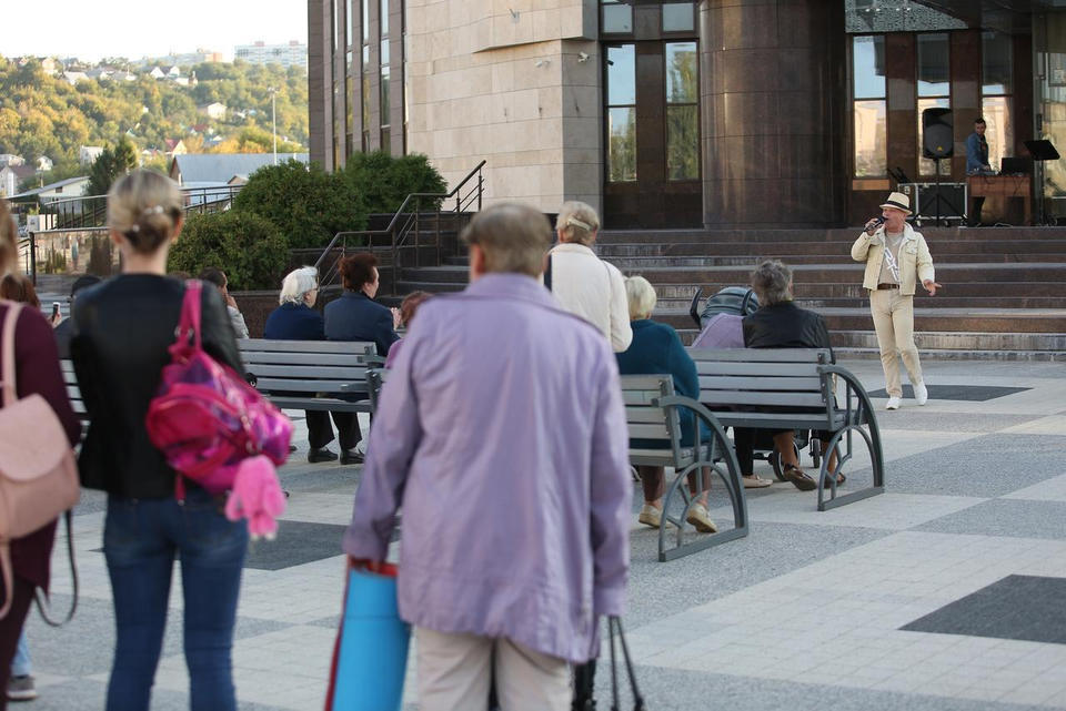 Артист подарил горожанам настоящий праздник музыки, исполнив популярные и любимые публикой эстрадные песни, советские шлягеры.