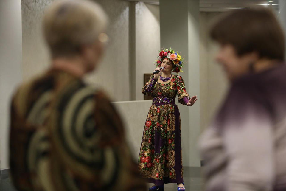 Перед концертом зрителей с программой «Добро пожаловать!» встречала артистка ансамбля «Злато-Серебро» Елена Миронычева.