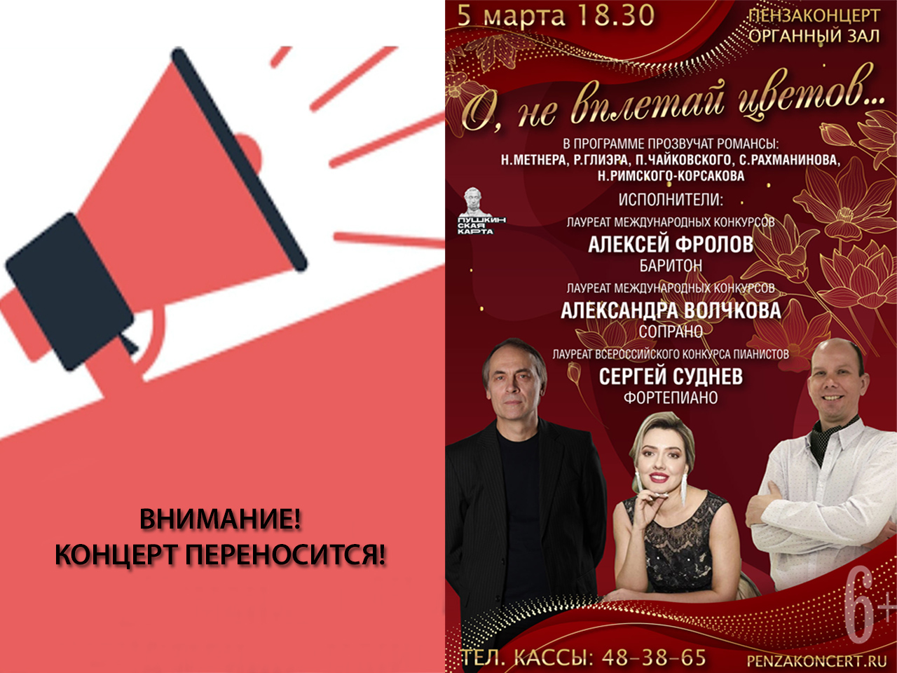 Концерт «О, не вплетай цветов», запланированный на 5 марта в 18.30 в Органном зале, переносится на 25 марта 18.30 в связи с болезнью артиста.