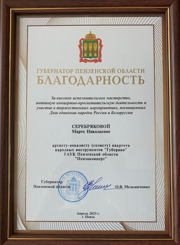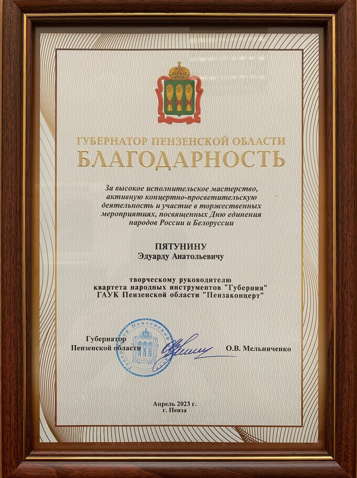Благодарность Губернатора Пензенской области объявлена ансамблю «Губерния», художественному руководителю коллектива Заслуженному работнику культуры Пензенской области Эдуарду Пятунину и солистке ансамбля Заслуженной артистке Пензенской области Марте Серебряковой за высокое исполнительское мастерство, активную концертно-просветительскую деятельность и участие в торжественных мероприятиях, посвященных Дню единения народов России и Белоруссии.