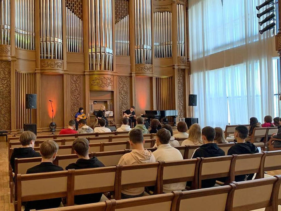 Ребята поучаствовали в экскурсии по филармонии, а затем в Органном зале для них выступили с концертной программой творческий коллектив «Экспромт» и концертмейстер Губернаторской симфонической капеллы Лаура Королева.