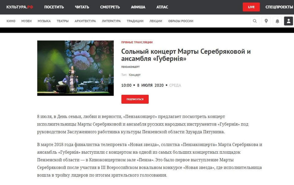 В марте 2018 года финалистка телепроекта «Новая звезда», солистка «Пензаконцерта» Марта Серебрякова и ансамбль «Губернiя» выступили с концертом на одной из самых больших концертных площадок Пензенской области — в Киноконцертном зале «Пенза». Это было первое выступление Марты Серебряковой после участия в III Всероссийском вокальном конкурсе «Новая звезда», где исполнительница вошла в тройку лидеров по итогам зрительского голосования.