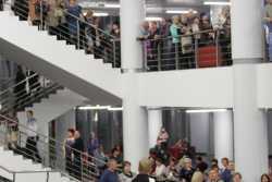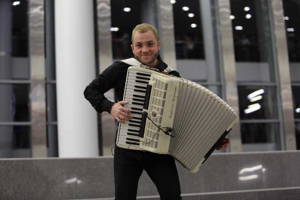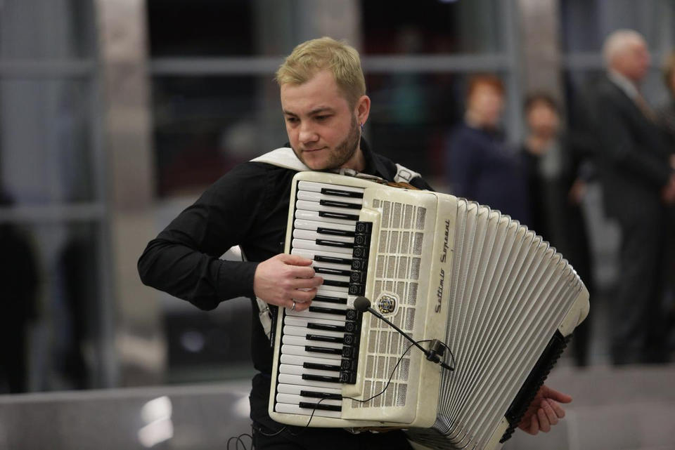 Перед концертом зрителей с программой «Добро пожаловать!» встречал артист ансамбля «Злато-Серебро» Илья Антонов (аккордеон).