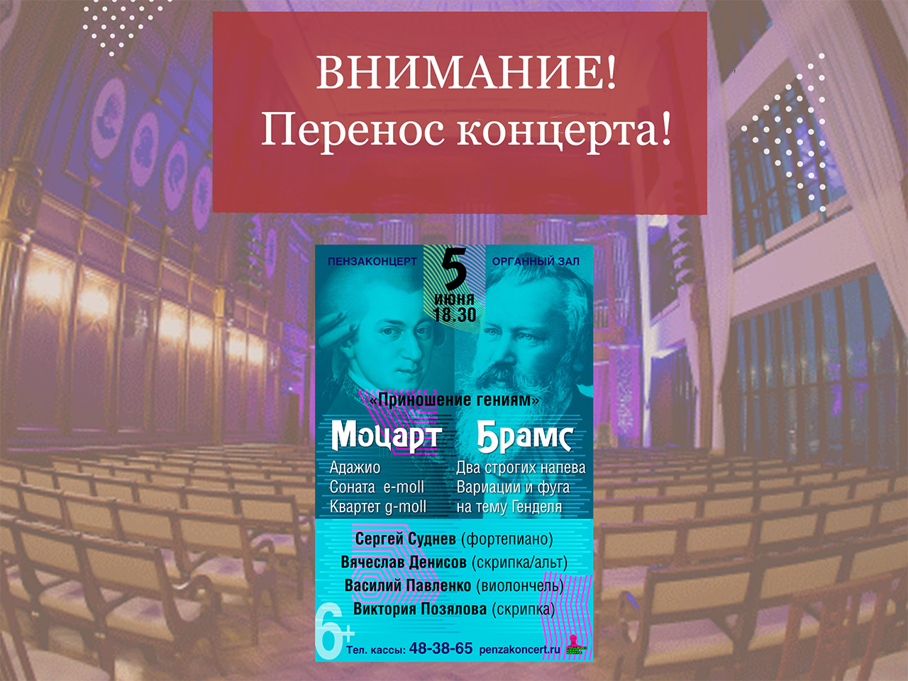 Концерт камерной музыки «Приношение гениям», который должен был состояться в Органном зале филармонии 14 апреля 2026 года в 18:30, переносится на 5 июня 2026 года 18:30.