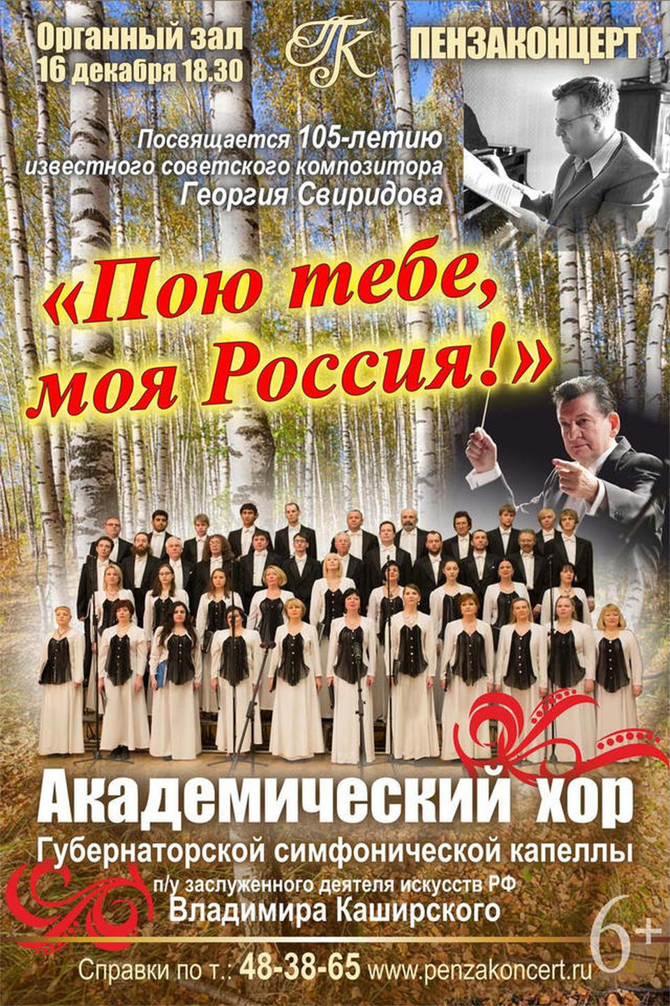 Академический хор Губернаторской симфонической капеллы п/у Заслуженного деятеля искусств России Владимира Каширского выступит 16 декабря в Органном зале филармонии с программой «Пою тебе, моя Россия!» (6+), посвящённой 105-летию известного советского композитора Георгия Свиридова.