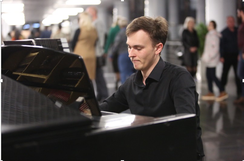 В фойе ККЗ зрителей встречал музыкант эстрадно-джазового ансамбля «Экспресс-бэнд» Геннадий Купринович (фортепиано) с музыкальной программой из цикла «Добро пожаловать!».