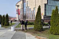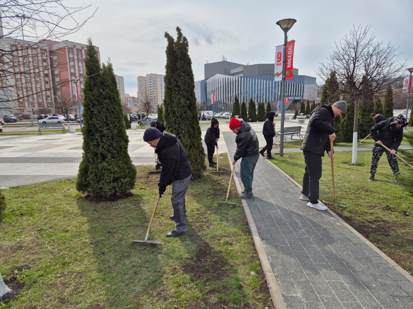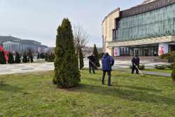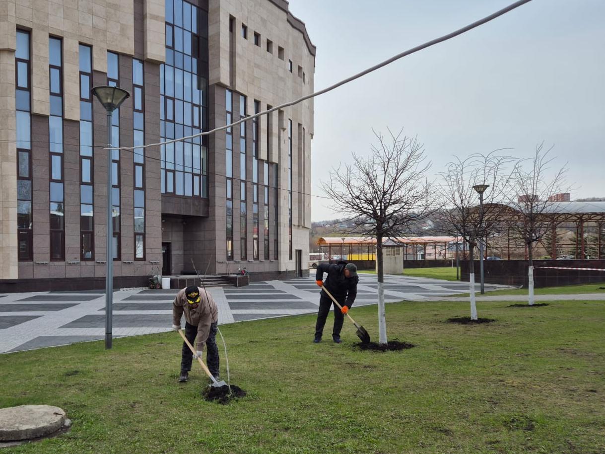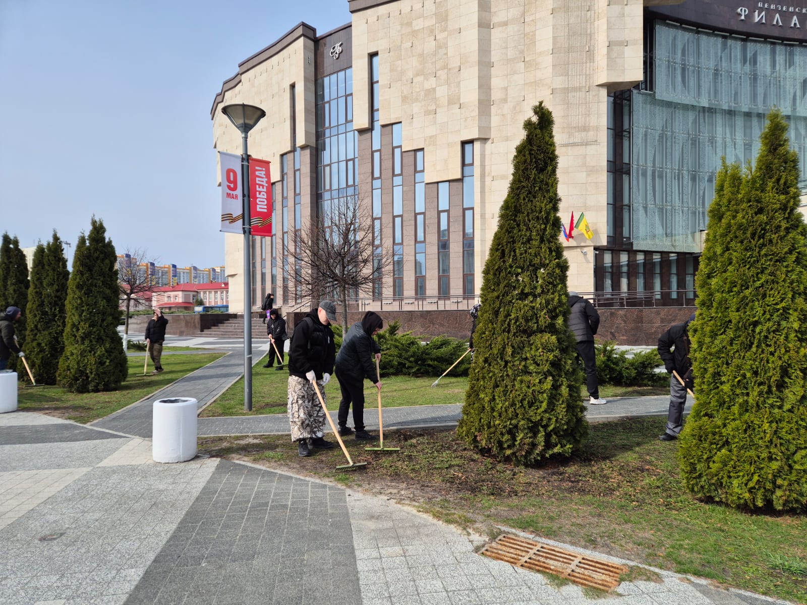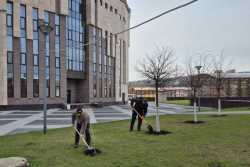 С помощью подручного инвентаря очистили газоны от сухой травы и сорняков, площадь – от мелкого мусора и пыли, а также вскопали землю вокруг деревьев.