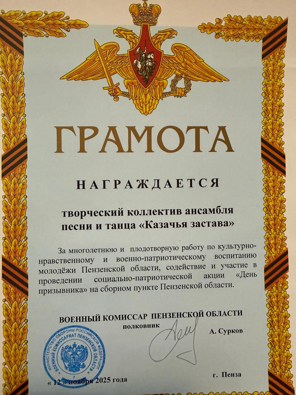12 ноября, в преддверии Дня призывника, ансамбль песни и танца «Казачья застава» выступил на сборном пункте Пензенской области.