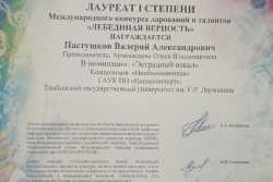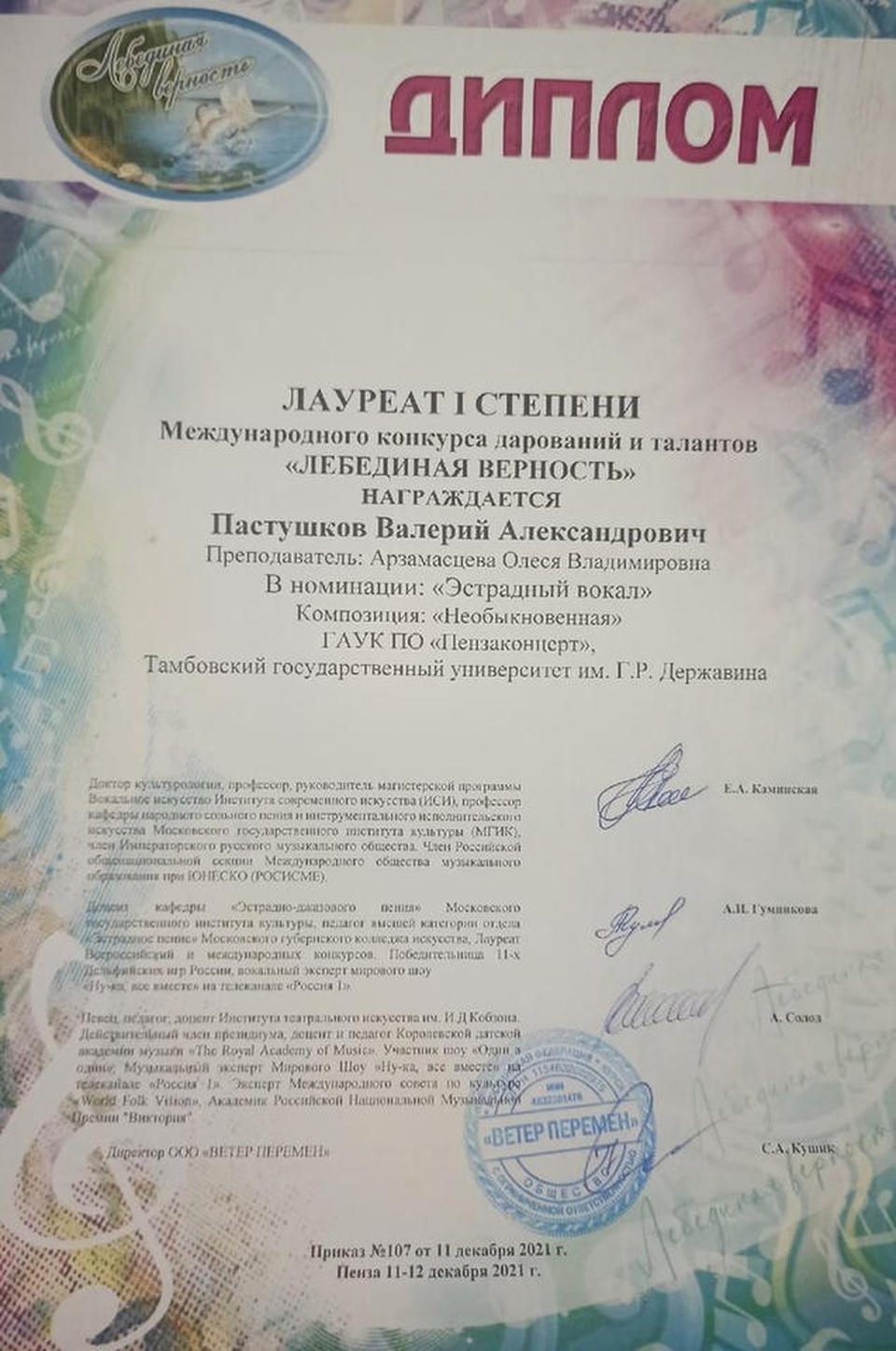 Артист группы «Калейдоскоп» Валерий Пастушков стал лауреатом 1 степени Международного конкурса в сфере хореографии, музыкального искусства и вокального исполнительства «Лебединая верность» - 2021, который проходил в «Пензаконцерте» с 11 по 12 декабря в Большом зале филармонии.