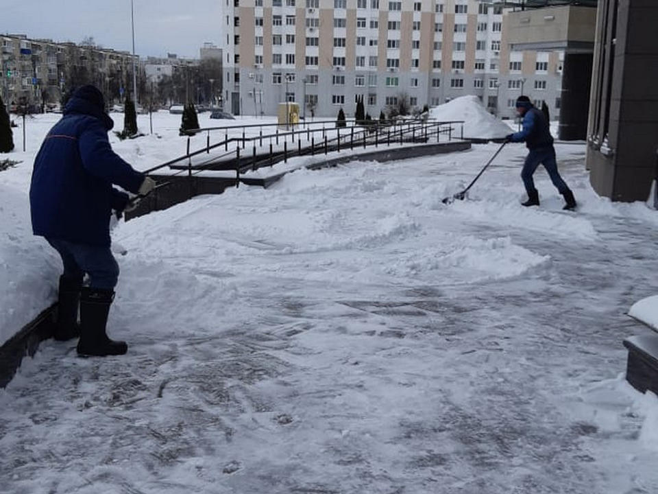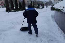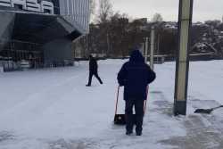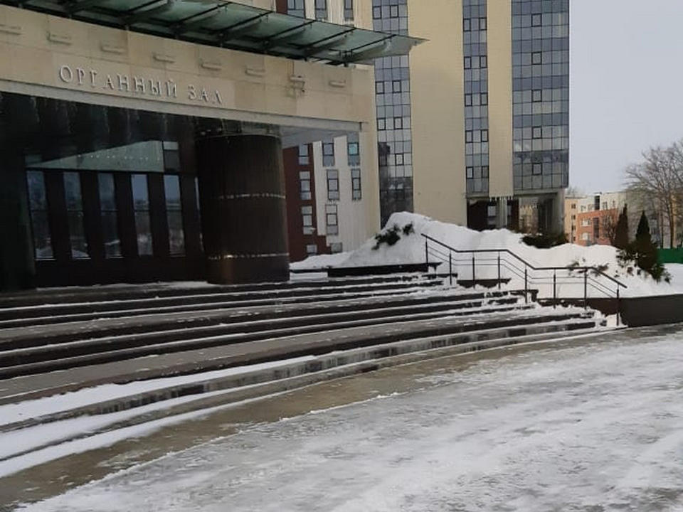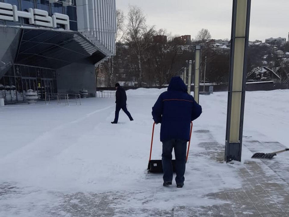 Сотрудники «Пензаконцерта» убирают снег и наледь на пешеходных дорожках и ступенях при помощи подручных средств и техники, а также посыпают территорию возле Киноконцертного зала «Пенза» и здания филармонии песком.