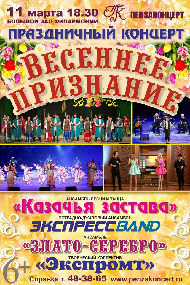 «Весеннее признание» сделают творческие коллективы «Пензаконцерта» в честь Международного женского дня! С праздничной программой под таким названием 11 марта в Большом зале филармонии выступят ансамбли «Злато-Серебро», «Экспресс-бэнд», «Казачья застава» и творческий коллектив «Экспромт».