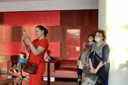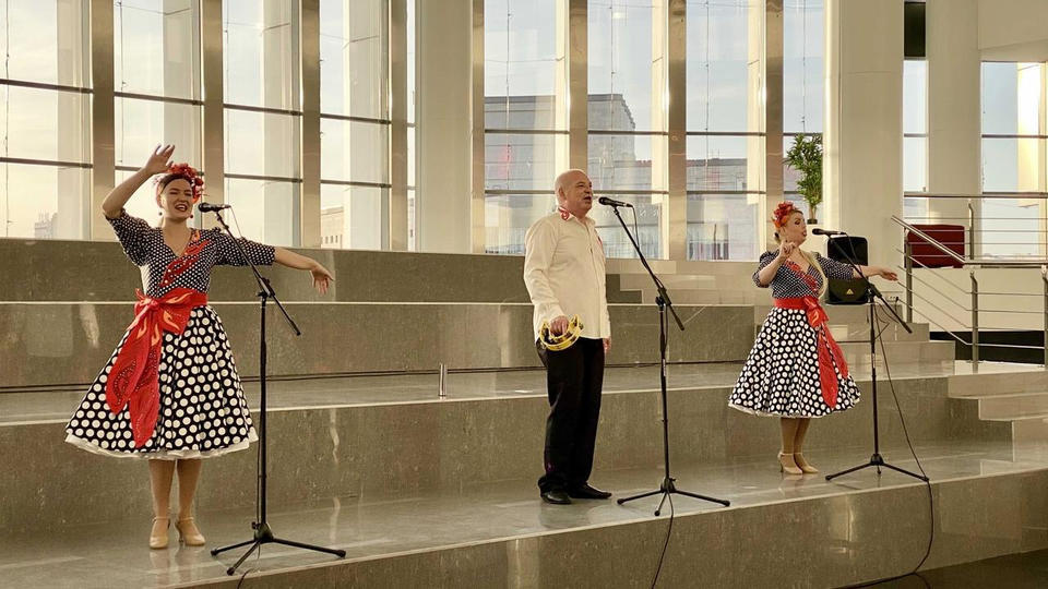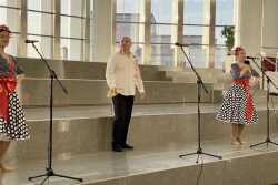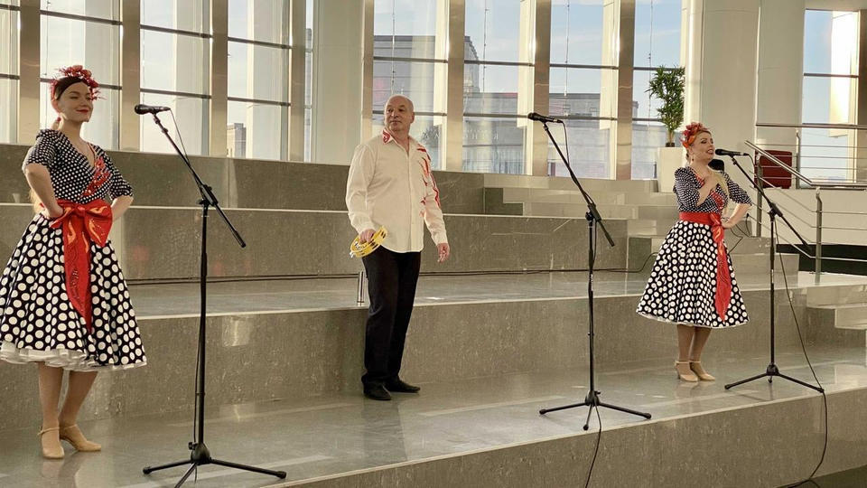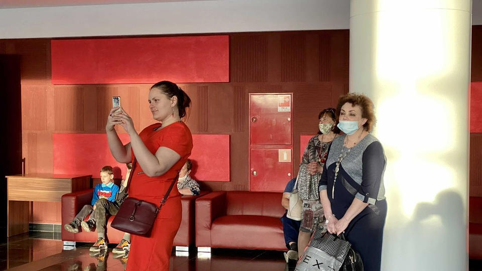 Перед сеансом зрителей с программой «Добро пожаловать!» встречали артисты ансамбля «Вольница» – Татьяна Долгова, Маргарита Артомина и Александр Клещёв.