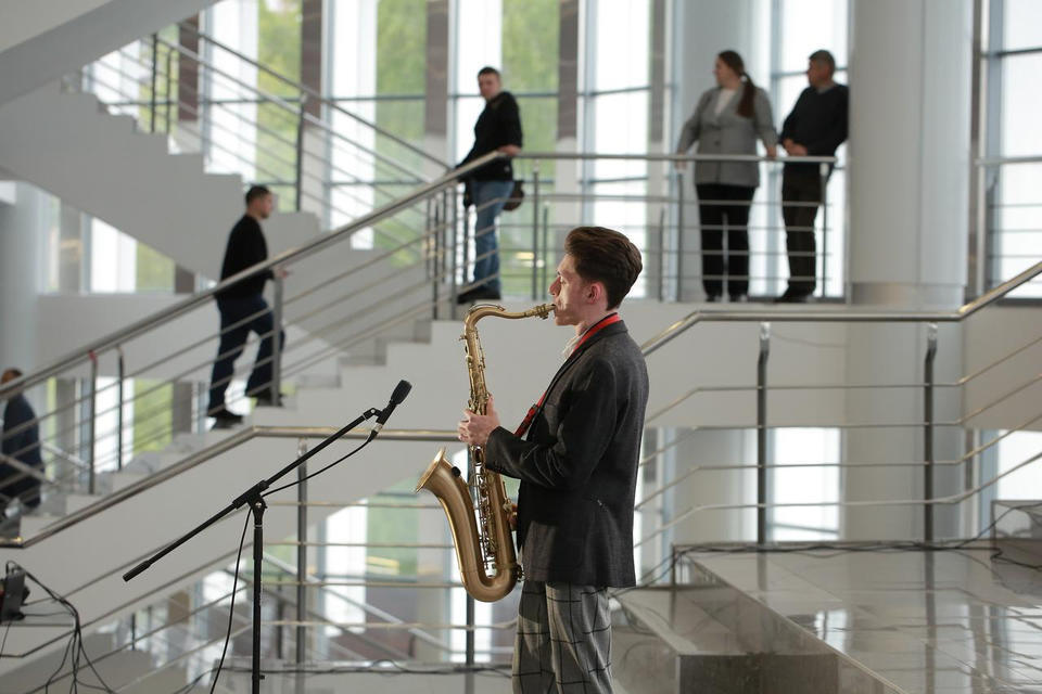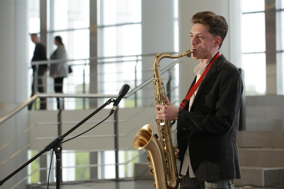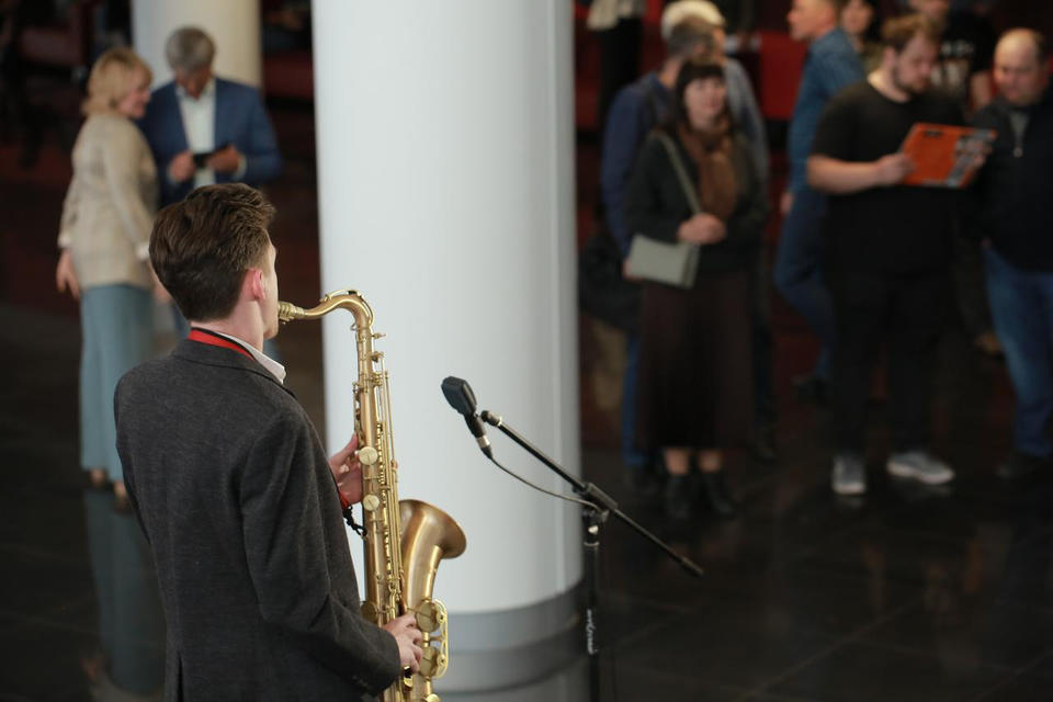 Перед концертом зрителей с программой «Добро пожаловать!» встречал музыкант эстрадно-джазового ансамбля «Экспресс-бэнд» Семён Бойков (саксофон).