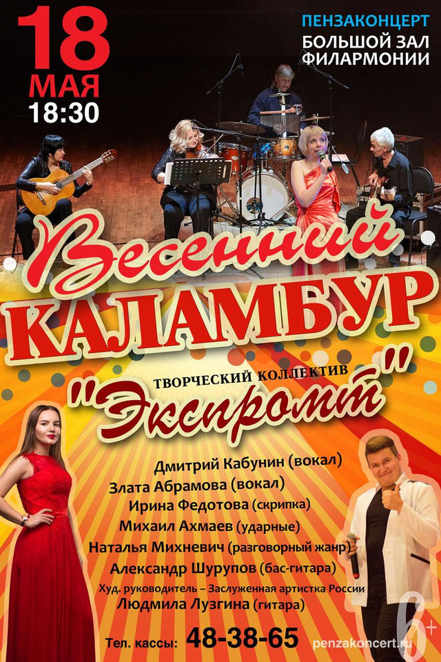 «Весенний каламбур» подготовил для зрителей творческий коллектив «Экспромт» (руководитель – Заслуженная артистка России Людмила Лузгина)! С оригинальной и яркой программой под таким названием артисты выступят 18 мая в Большом зале филармонии (6+).