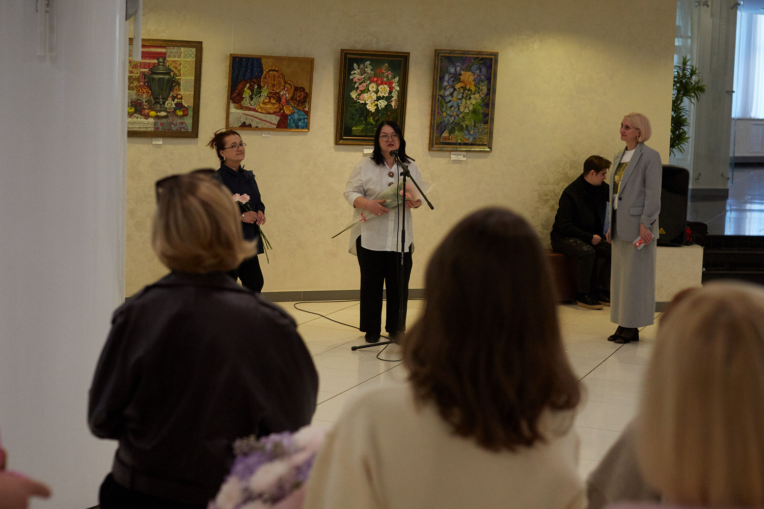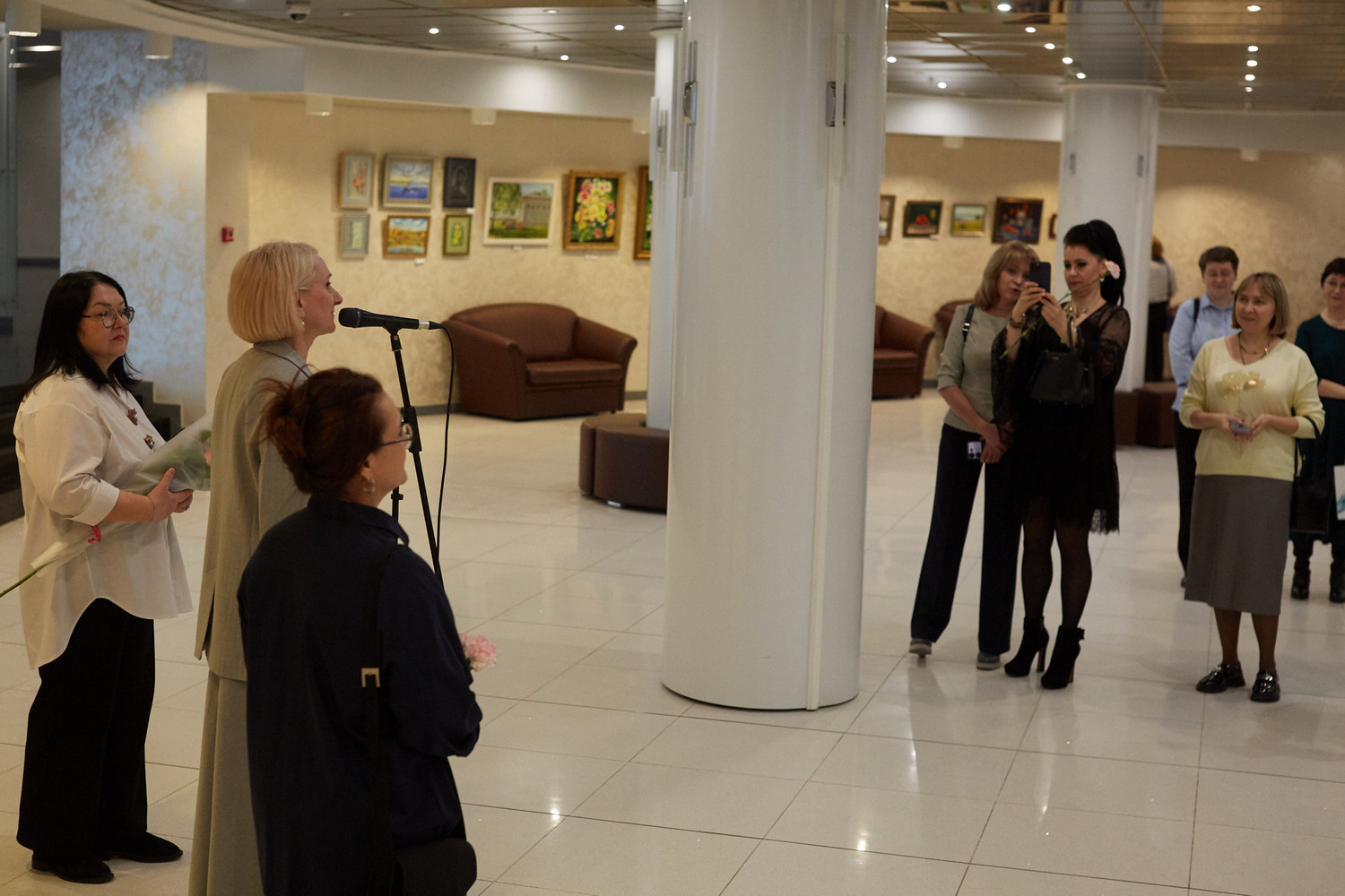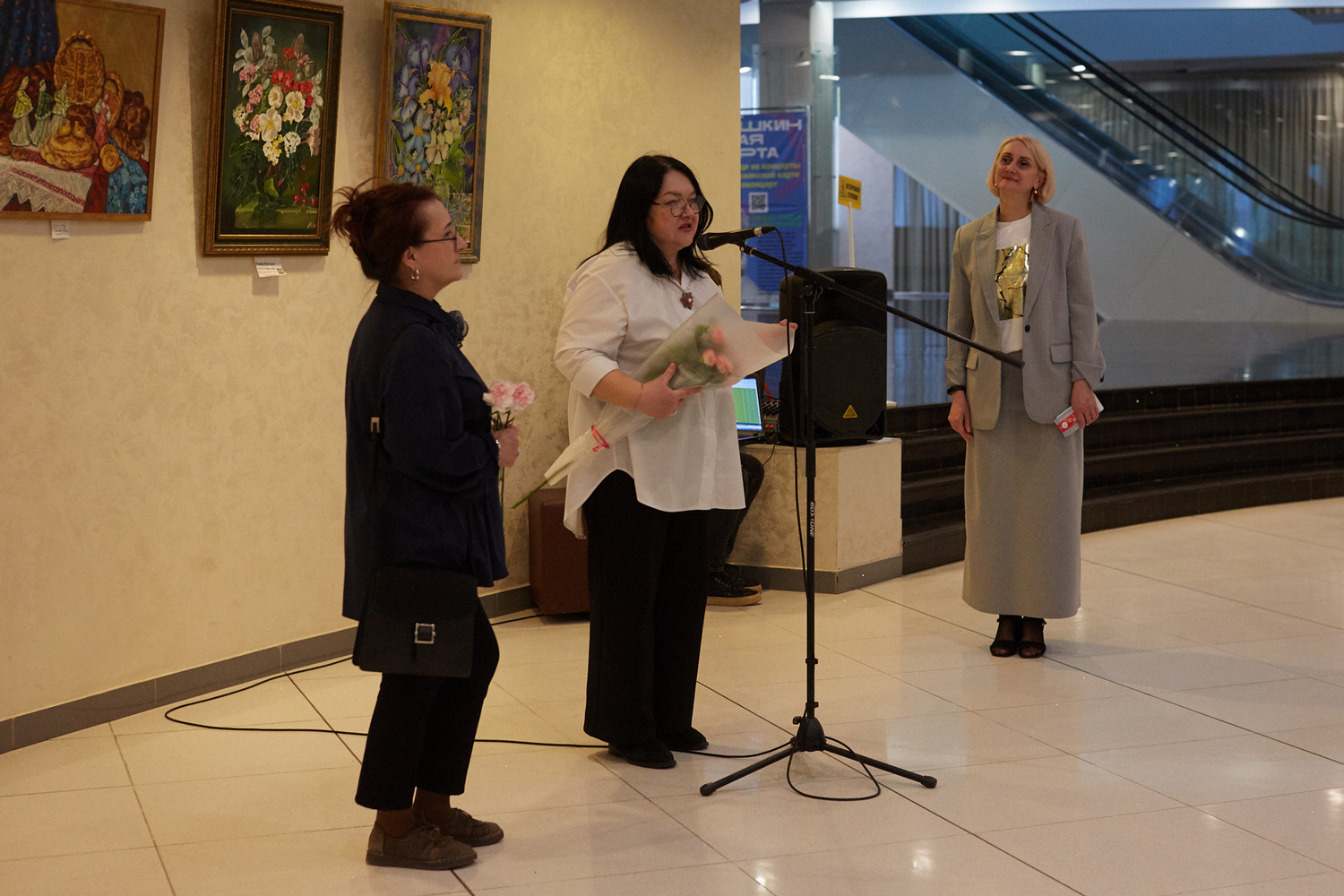 Гостей выставки поприветствовали педагоги авторов представленных картин – члены Союза художников России Татьяна Пентюх, Татьяна Чагорова и Мария Королькова.