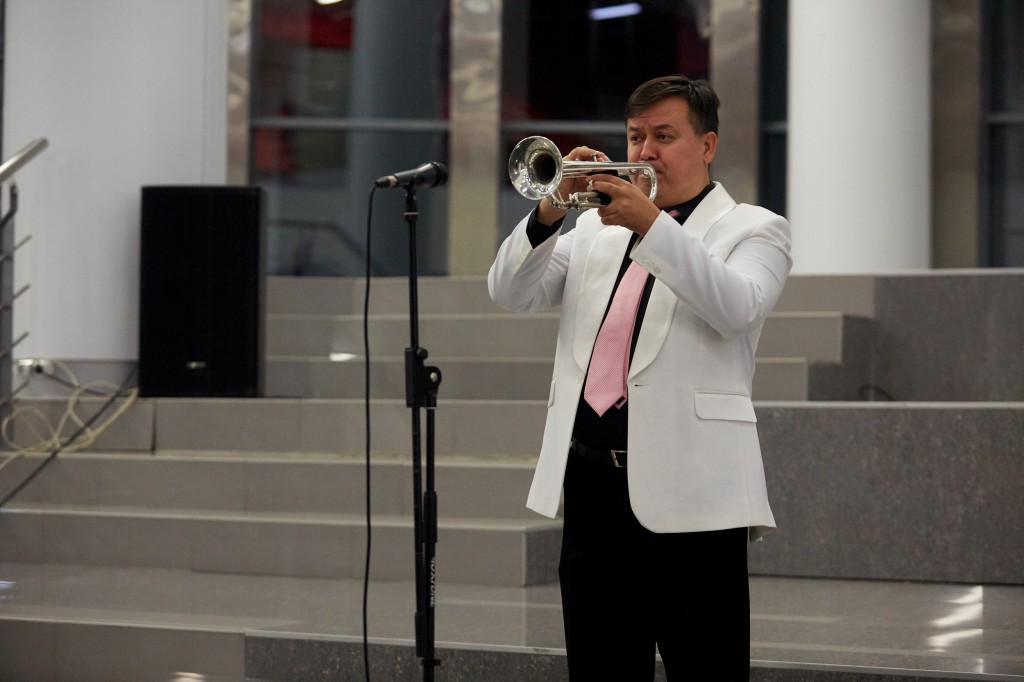 Гостей вечера с музыкальной программой «Добро пожаловать!» встречал руководитель эстрадно-джазового ансамбля «Экспресс-бэнд» Юрий Белоногов (труба).