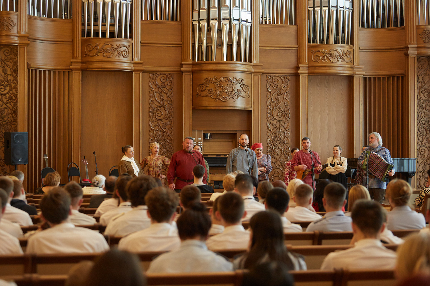 Сегодня в Органном зале филармонии ансамбль русской этнической музыки «Миряне» представил программу под названием «Нам чужой земли не надо, но и своей не отдадим», посвященная 80-летию Победы советского народа в Великой Отечественной войне 1941-1945 гг.