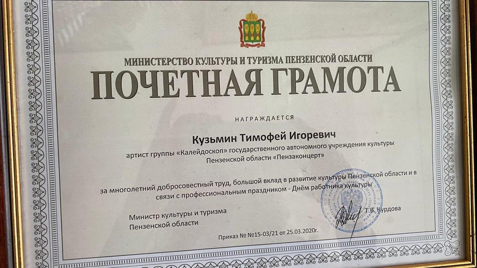 Солист эстрадно-джазового ансамбля «Экспресс-бэнд» Александр Ренуар и артист группы «Калейдоскоп» Тимофей Кузьмин награждены Почётными Грамотами Министерства культуры и туризма Пензенской области.