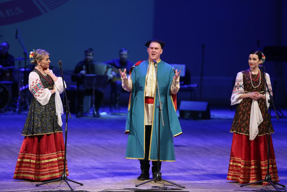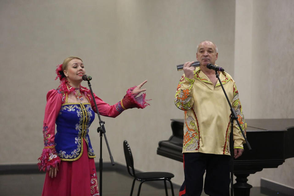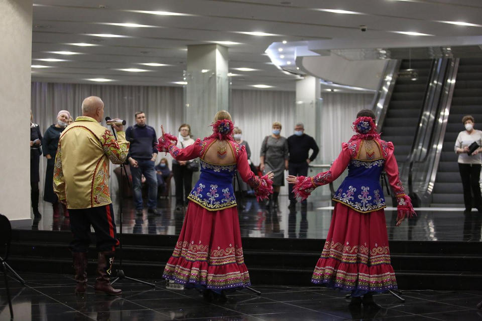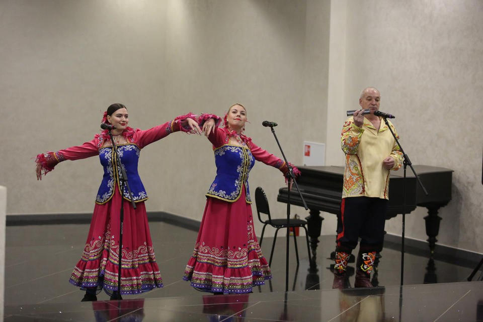Перед концертом зрителей с программой «Добро пожаловать!» встречали артисты ансамбля «Вольница» – Татьяна Долгова, Маргарита Артомина и Александр Клещёв.