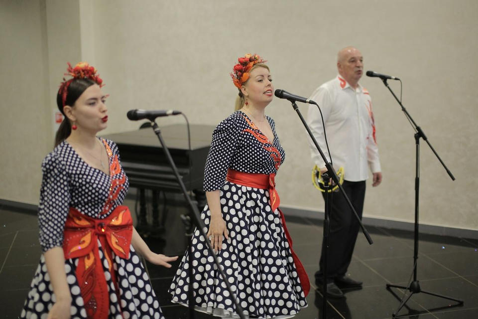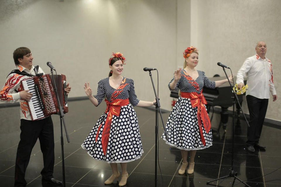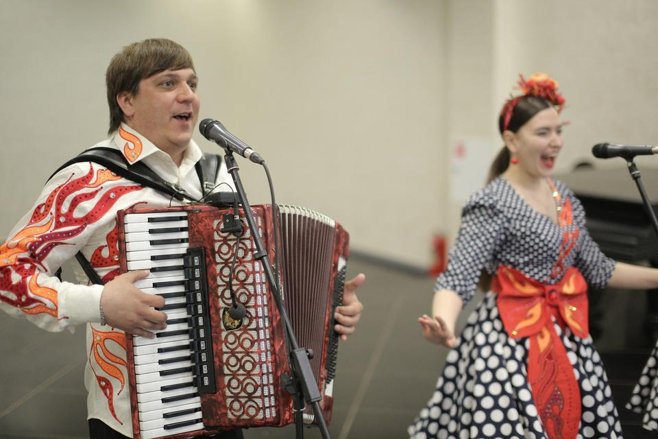 Перед спектаклем зрителей с программой «Добро пожаловать!» встречали артисты ансамбля «Вольница».