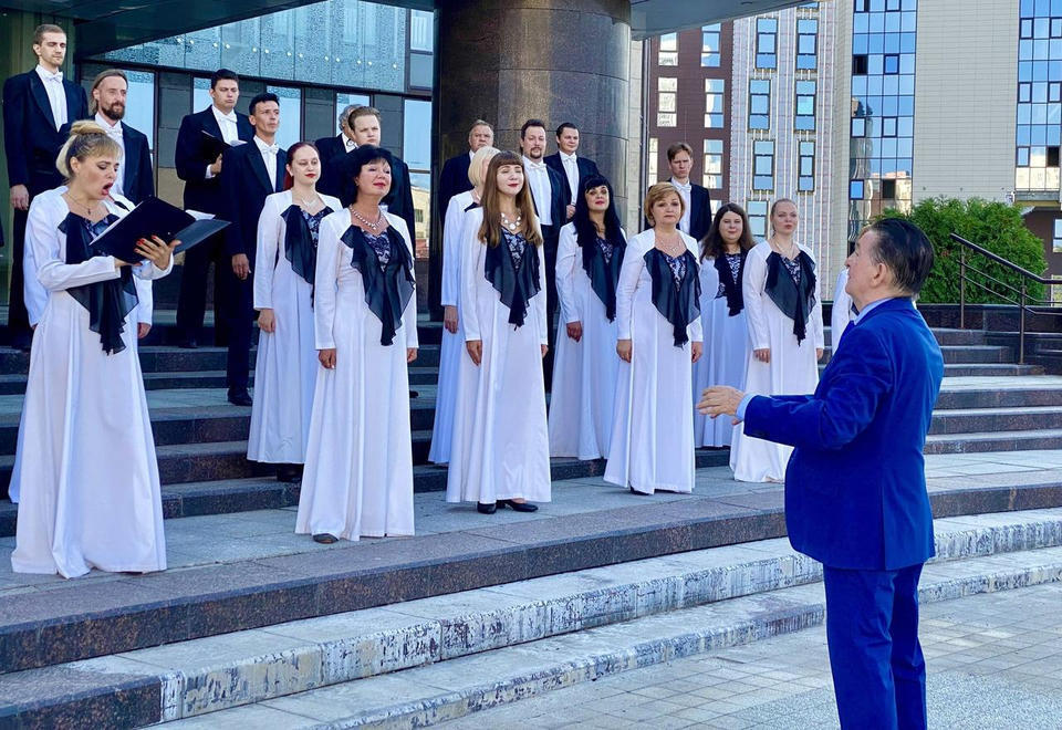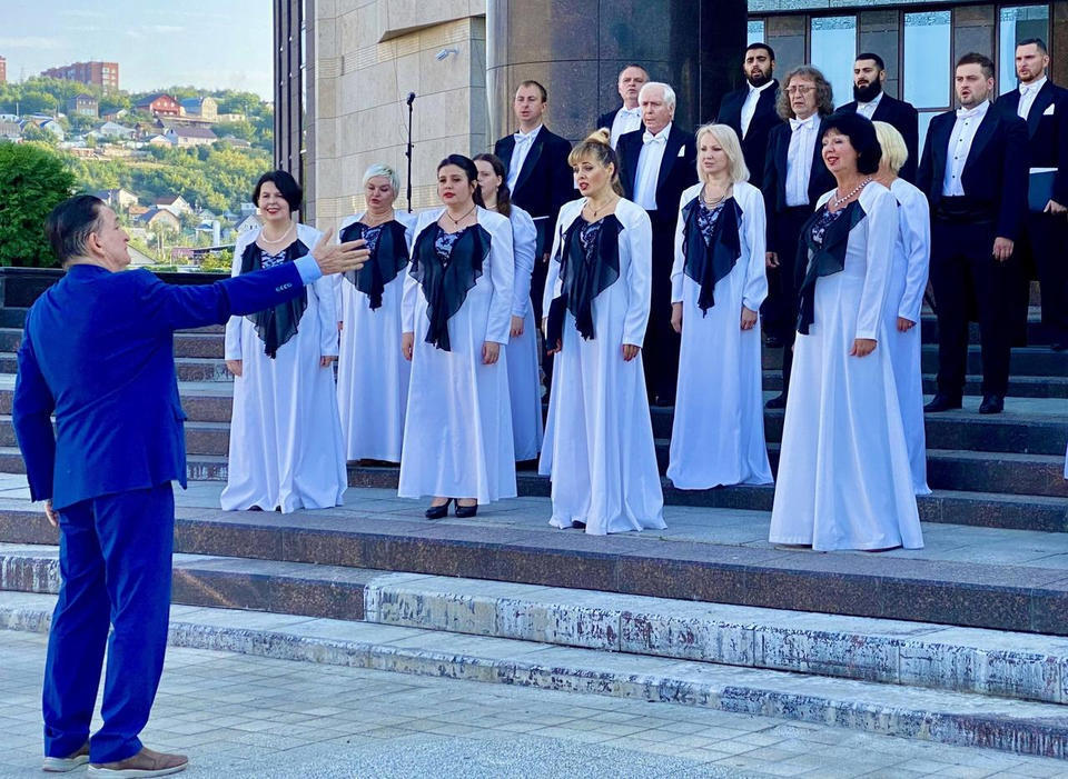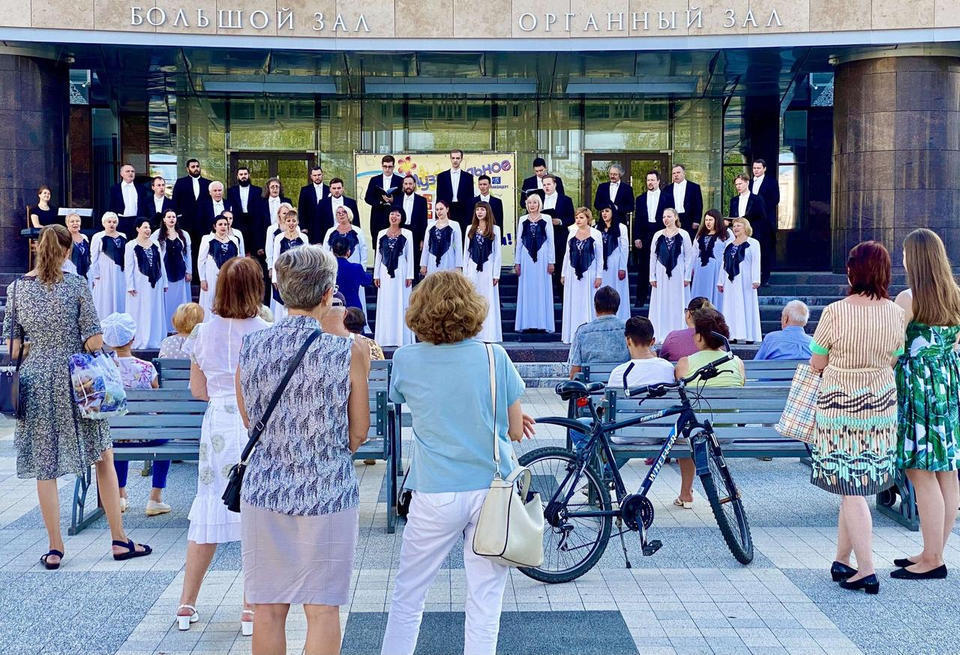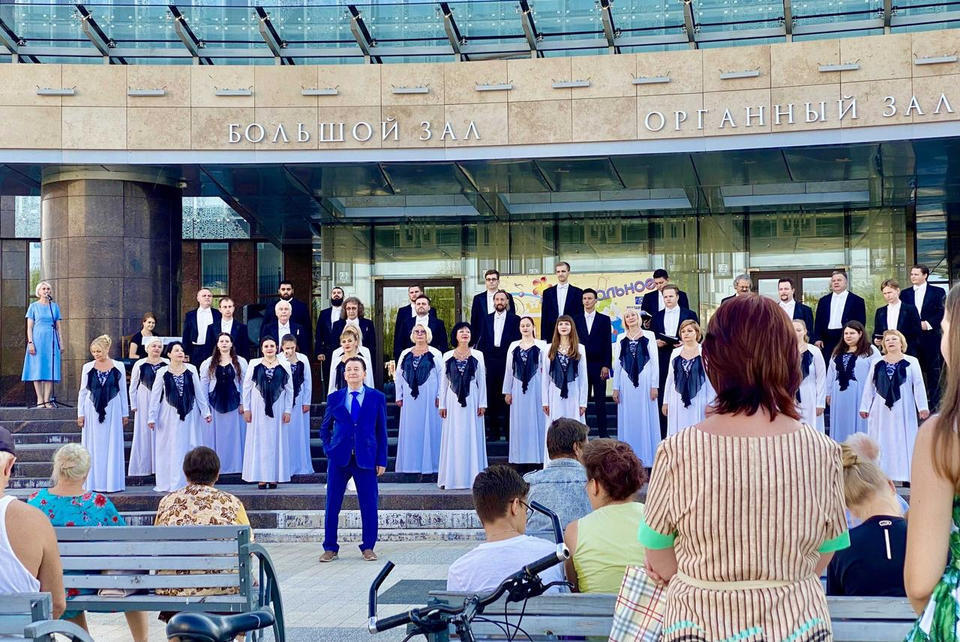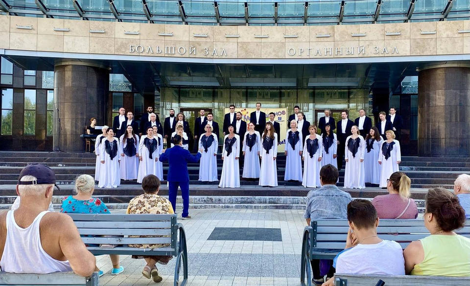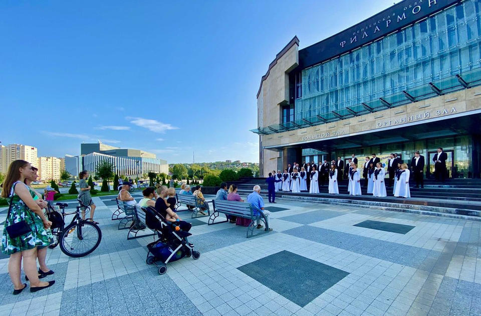18 августа на площади возле центрального входа в здание филармонии выступил академический хор Губернаторской симфонической капеллы п/у Заслуженного деятеля искусств России Владимира Каширского.