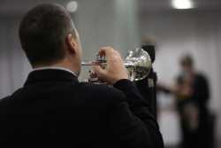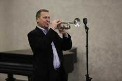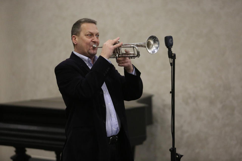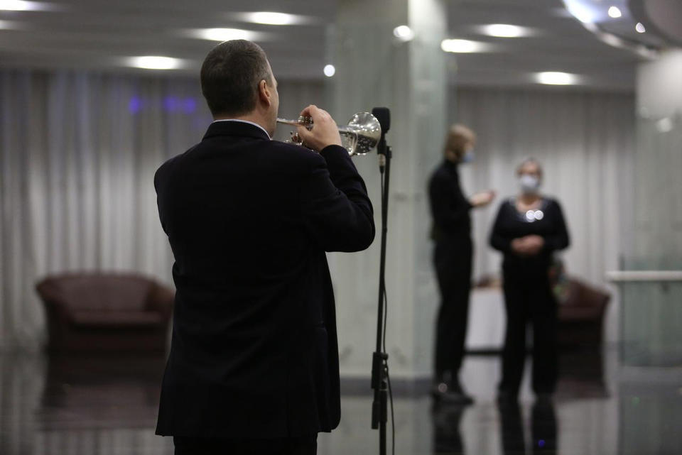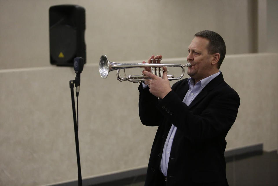 Перед концертом зрителей с программой «Добро пожаловать!» встречал музыкант ансамбля «Казачья застава» Александр Мереняшев (труба).