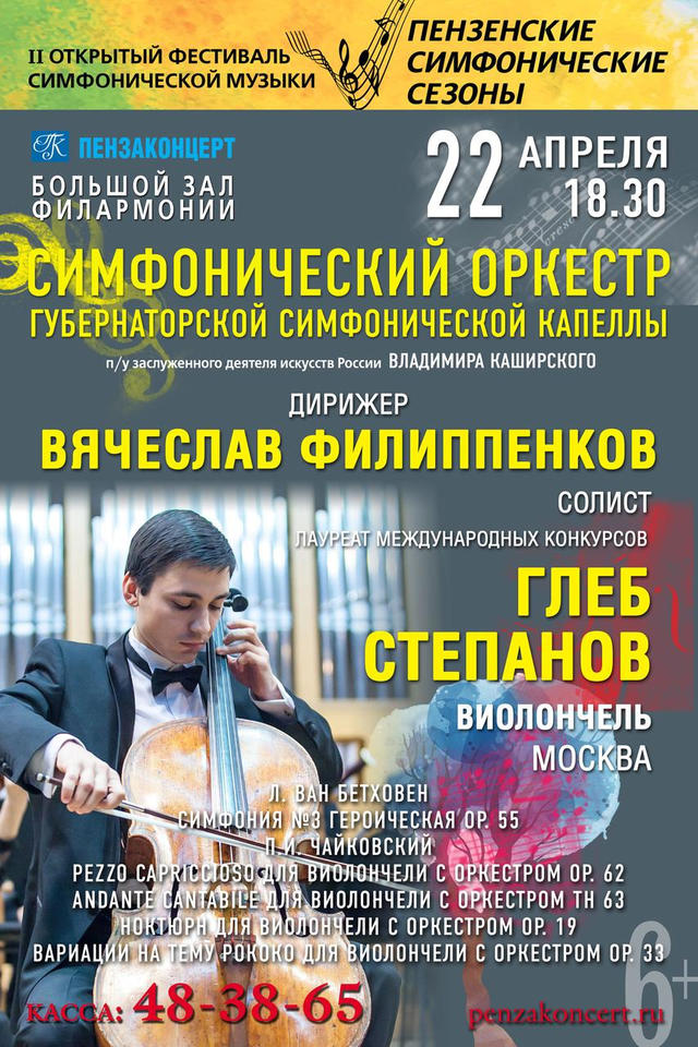 Известный российский виолончелист Глеб Степанов (г. Москва) выступит в «Пензаконцерте» 22 апреля с оркестром Губернаторской симфонической капеллы, управлять которым будет Заслуженный артист Пензенской области Вячеслав Филиппенков.