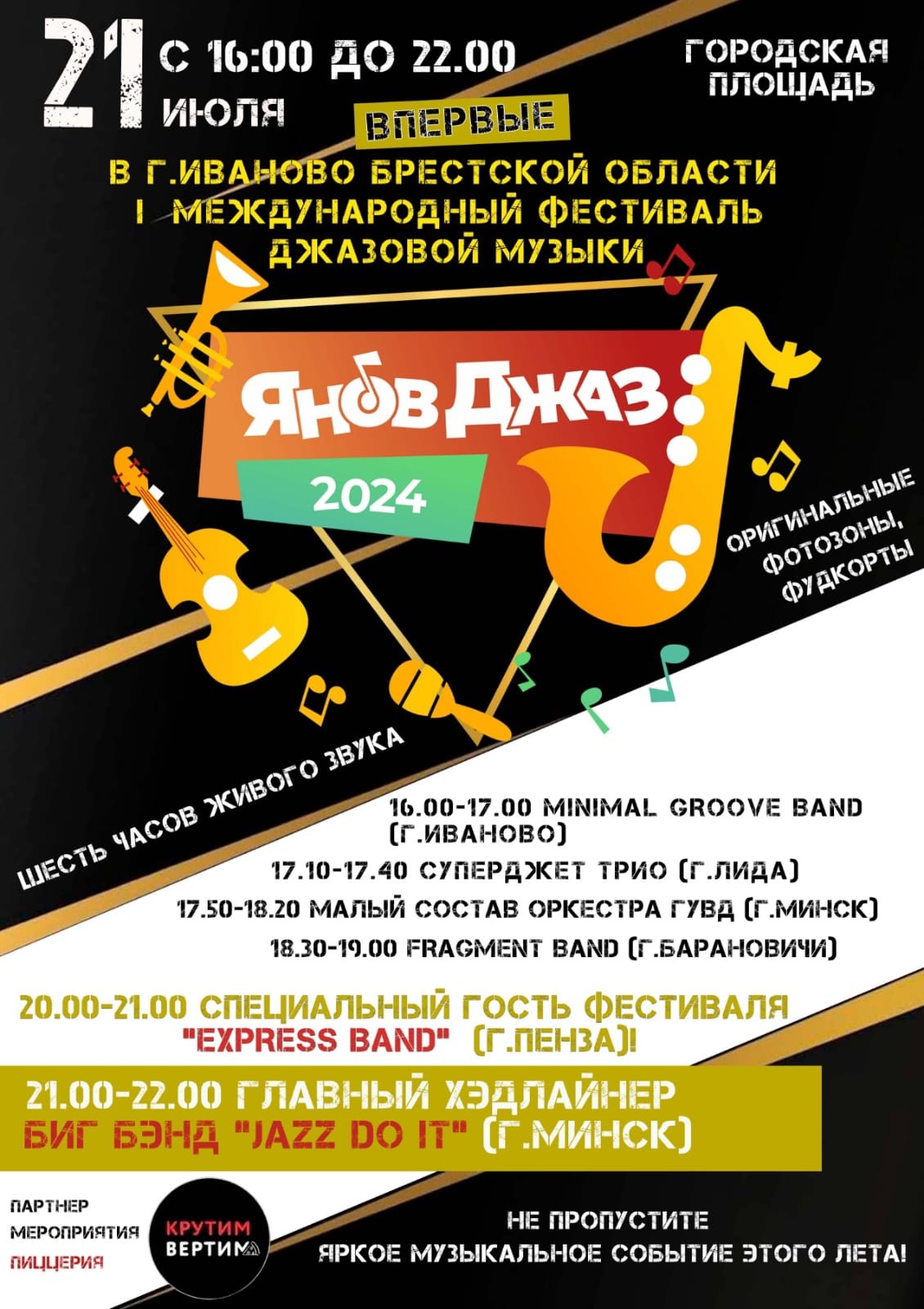 Сегодня эстрадно-джазовый ансамбль «Экспресс-бэнд» п/у Юрия Белоногова отправился в г. Иваново Республики Беларусь, где уже в ближайшее воскресенье, 21 июля, примет участие в I Международном фестивале джазовой музыки «Янов Джаз 2024».