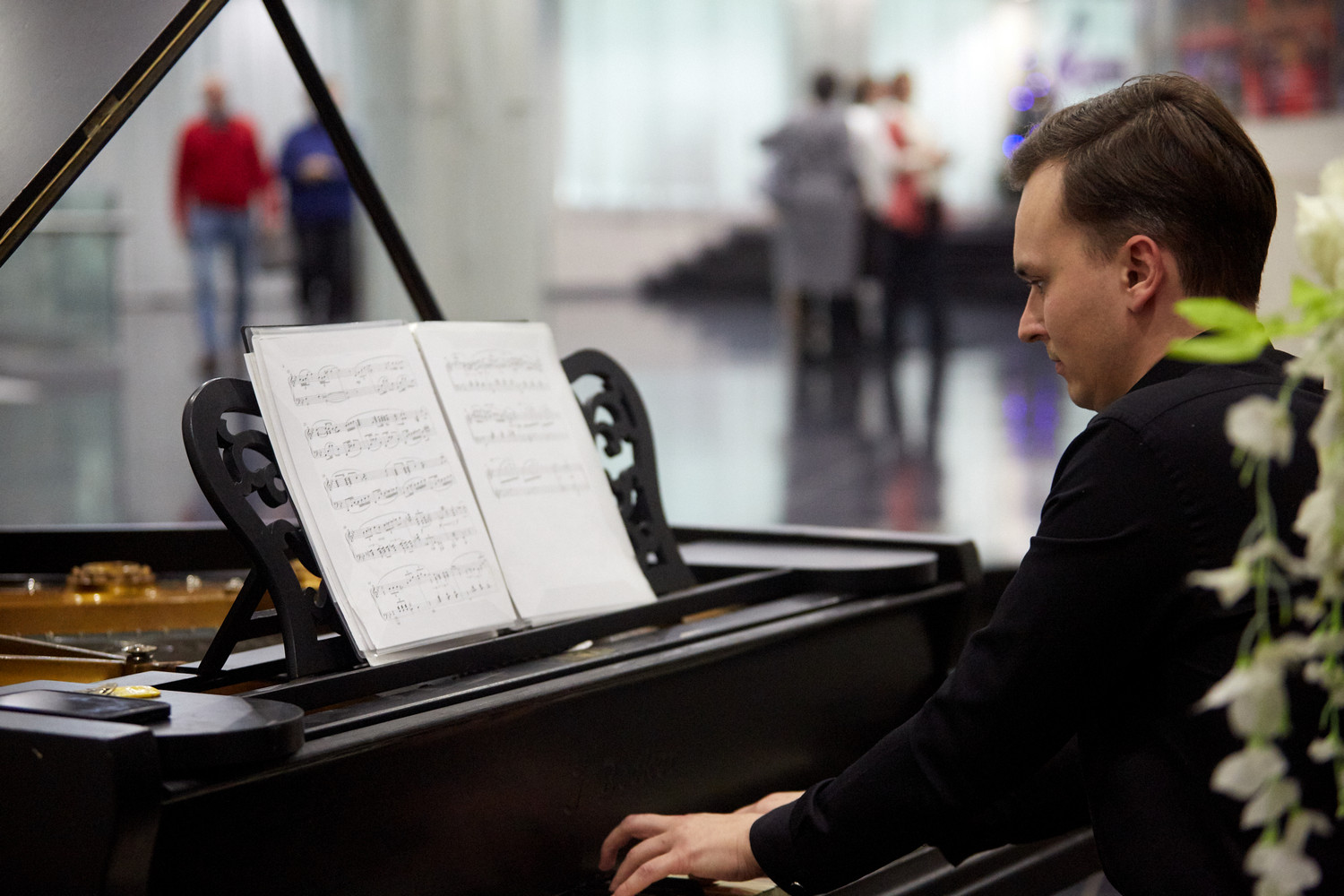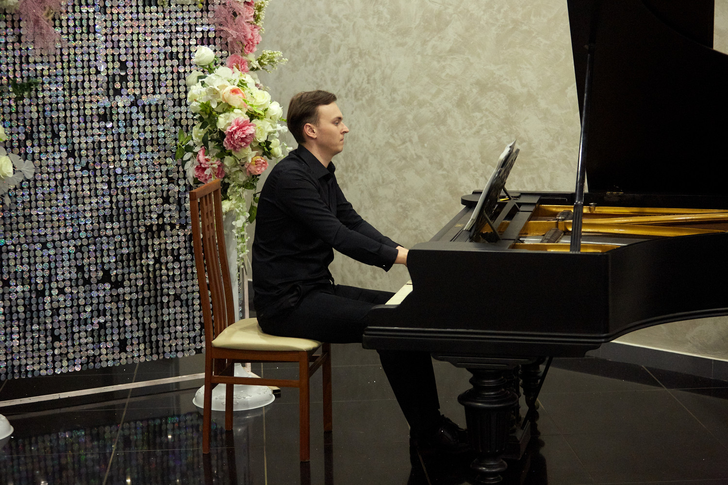 Перед концертом зрителей с программой «Добро пожаловать!» встречал музыкант эстрадно-джазового ансамбля «Экспресс-бэнд» Геннадий Купринович (фортепиано).