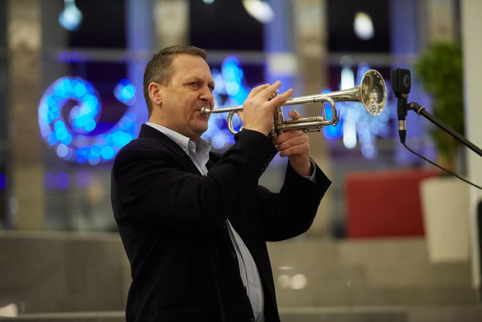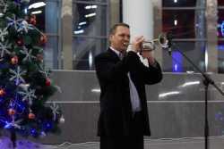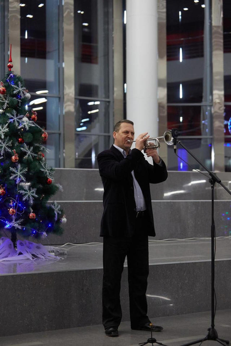 Перед концертом зрителей с программой «Добро пожаловать!» встречал артист ансамбля «Казачья застава» Александр Мереняшев (труба).