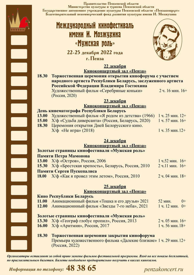 Международный кинофестиваль имени Ивана Мозжухина «Мужская роль» пройдёт в Пензенской области с 22 по 25 декабря 2022 года. Об этом в ходе пресс-конференции, прошедшей в Киноконцертном зале «Пенза» 20 декабря, сообщили организаторы фестиваля – заместитель Министра культуры и туризма Пензенской области Владимир Карпов, Директор ГАУК ПО «Пензаконцерт» Андрей Мамонов и Президент кинофестиваля Светлана Старостина.