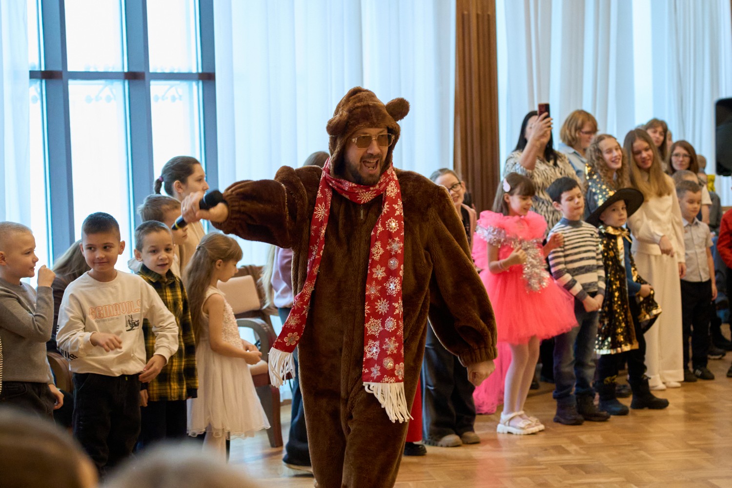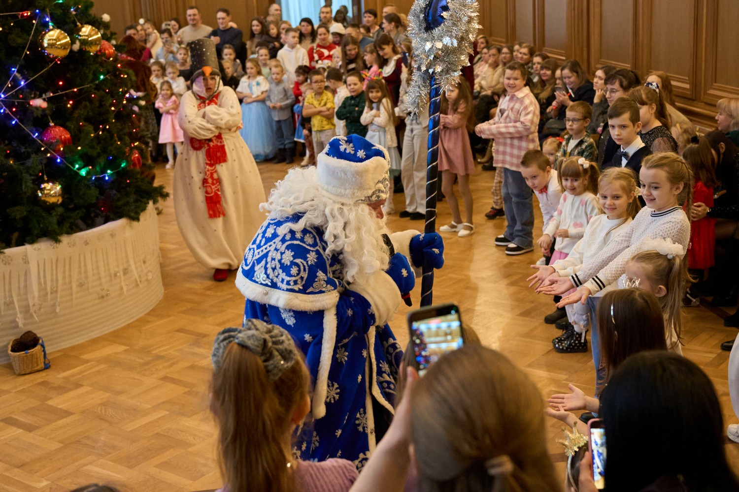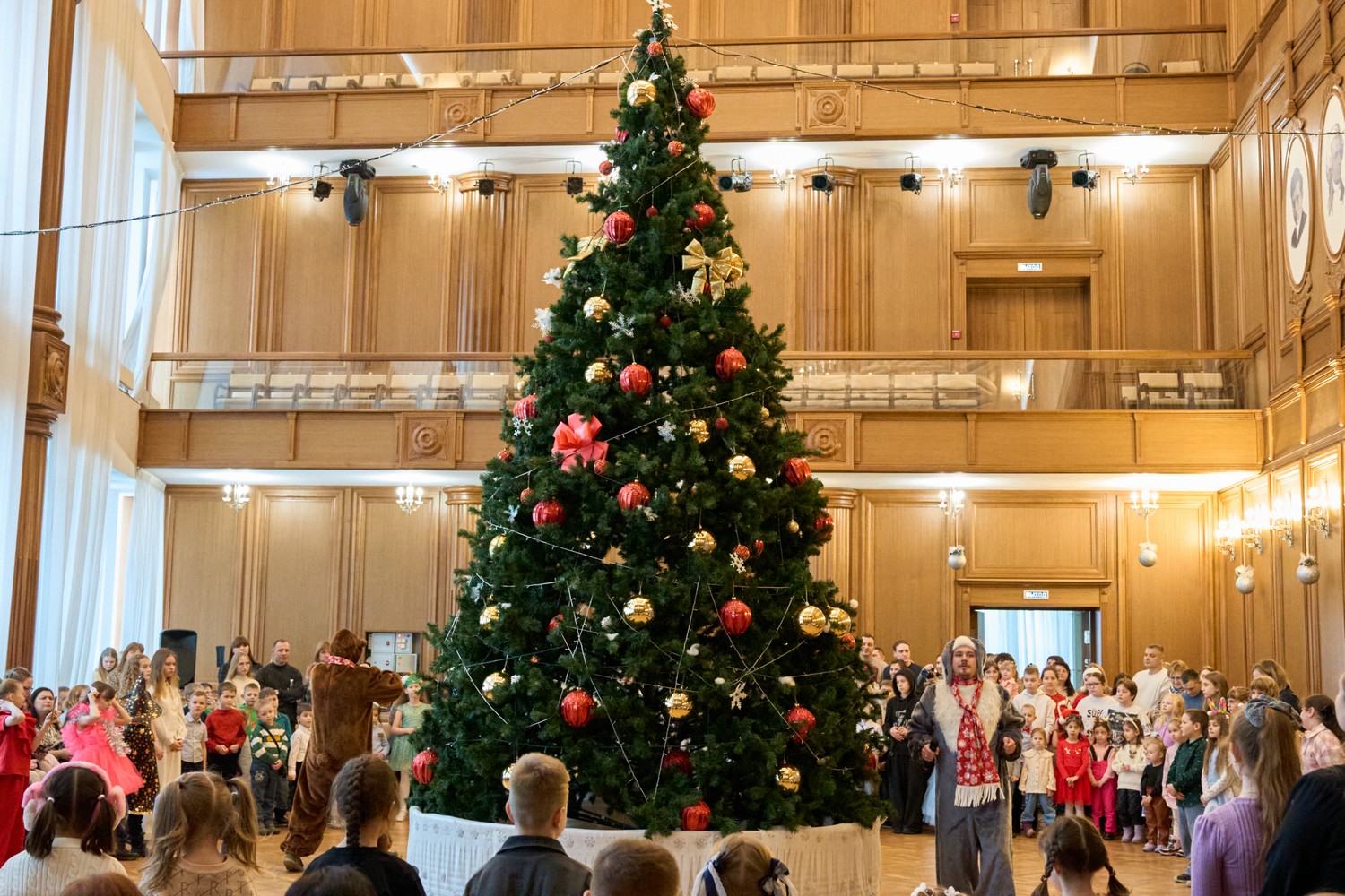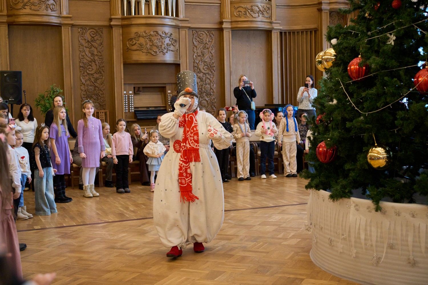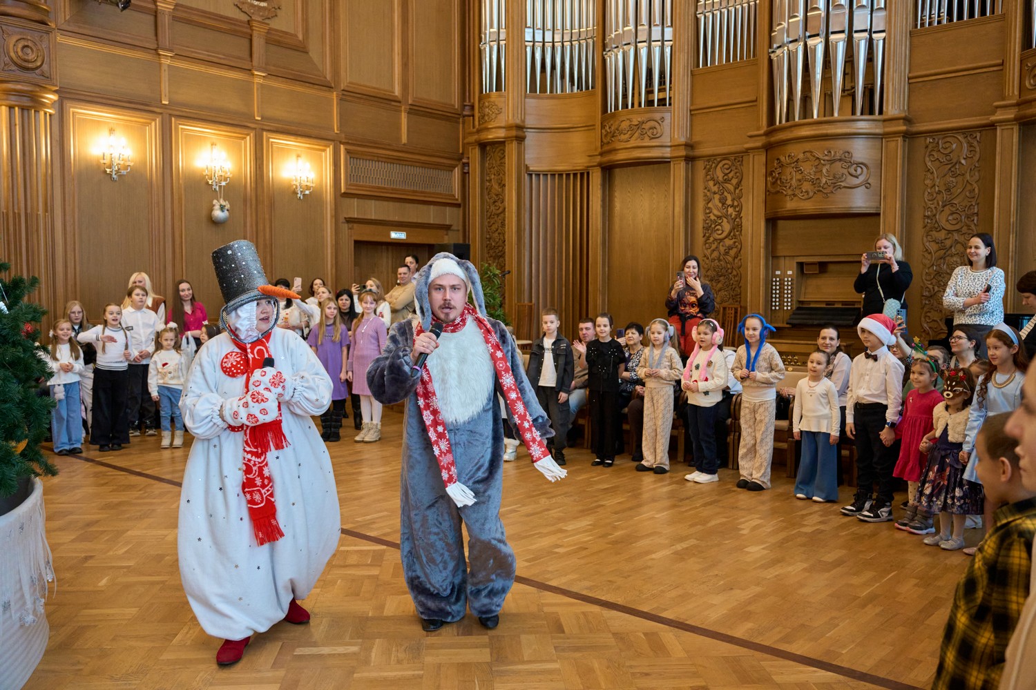 В Органном зале филармонии, у красавицы‑ёлки, юных гостей встретили сказочные герои — весёлый Снеговик, озорной Зайчик и стильный Мишка. В компании любимых персонажей ребята пели новогодние песни, водили хоровод и играли в задорные игры. А затем дружно позвали Деда Мороза и Снегурочку, чтобы вместе зажечь сверкающие огни на ёлке.