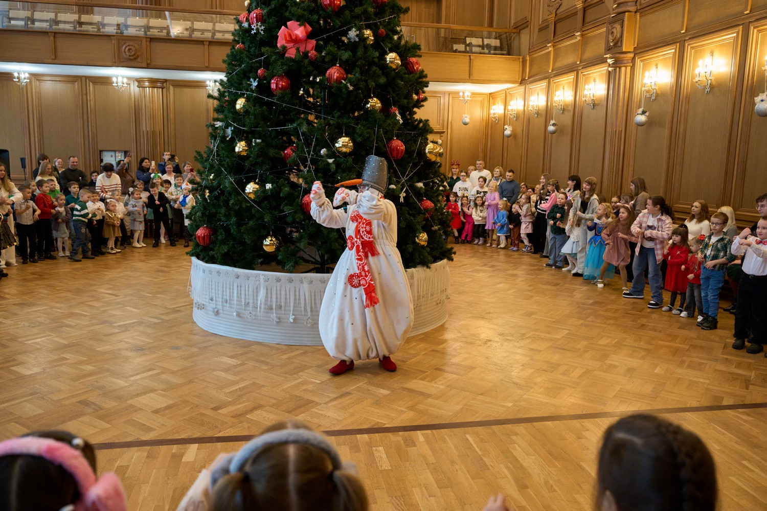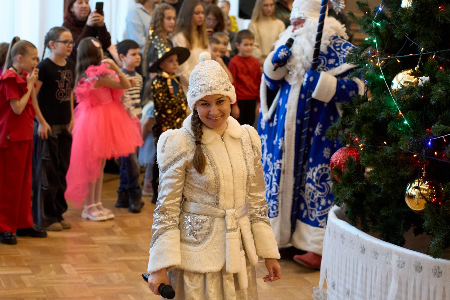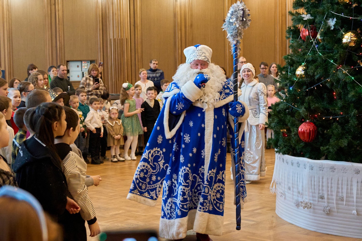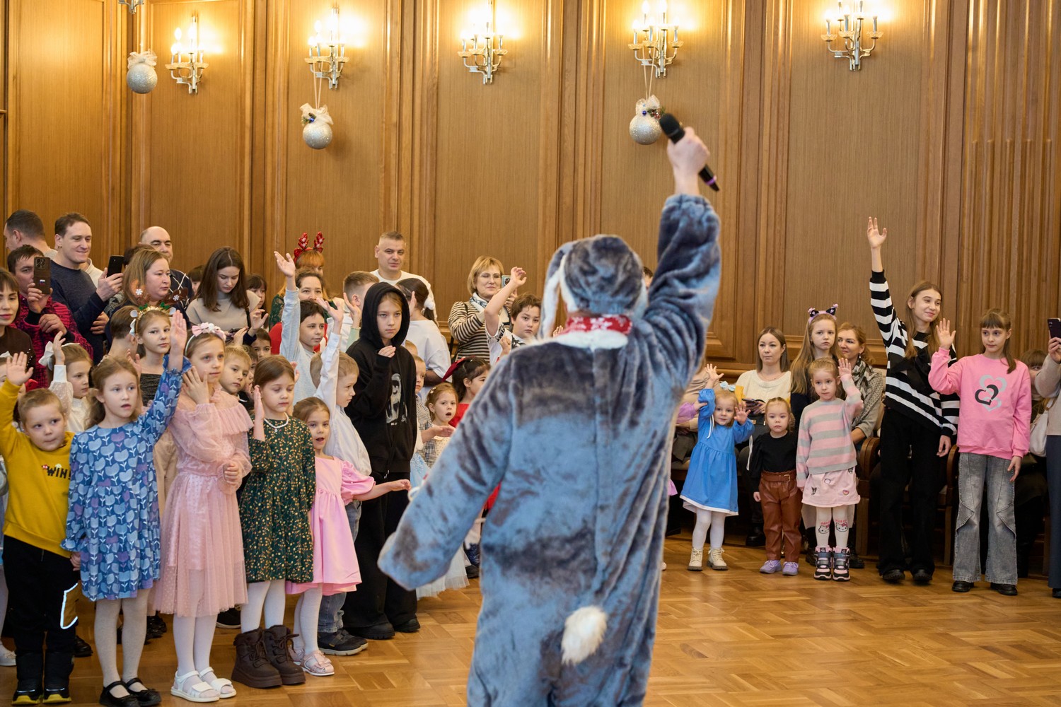В Органном зале филармонии, у красавицы‑ёлки, юных гостей встретили сказочные герои — весёлый Снеговик, озорной Зайчик и стильный Мишка. В компании любимых персонажей ребята пели новогодние песни, водили хоровод и играли в задорные игры. А затем дружно позвали Деда Мороза и Снегурочку, чтобы вместе зажечь сверкающие огни на ёлке.
